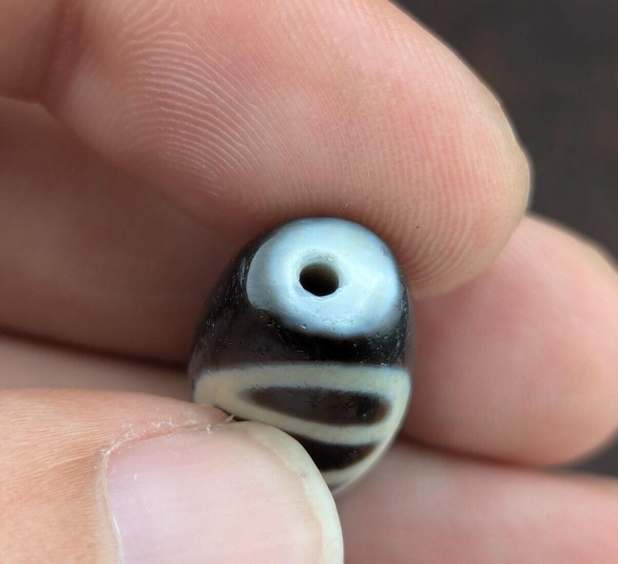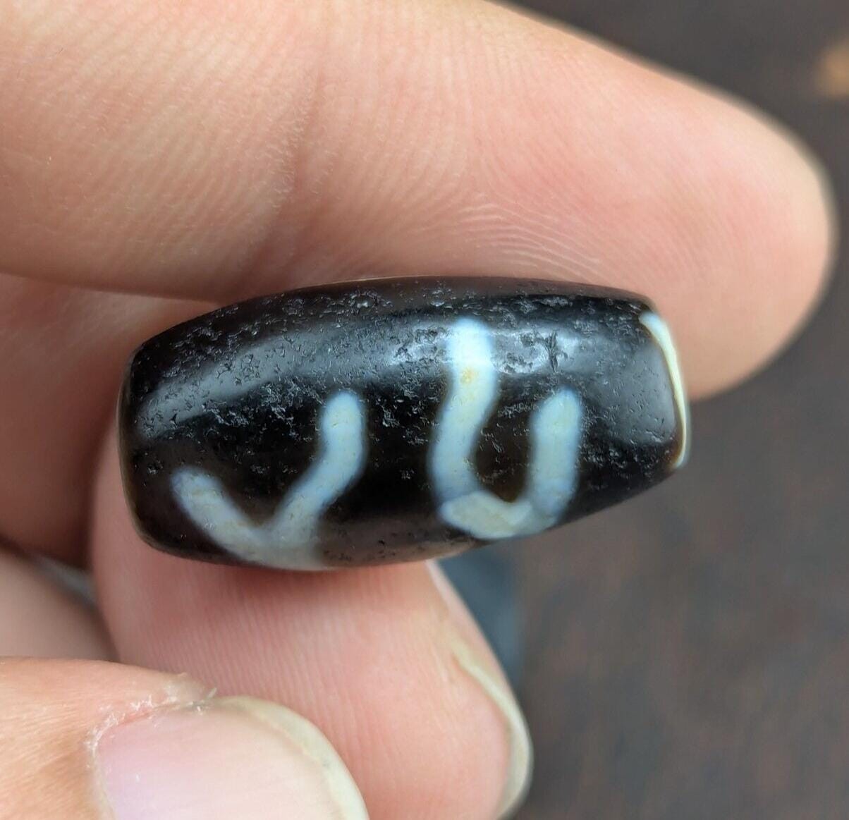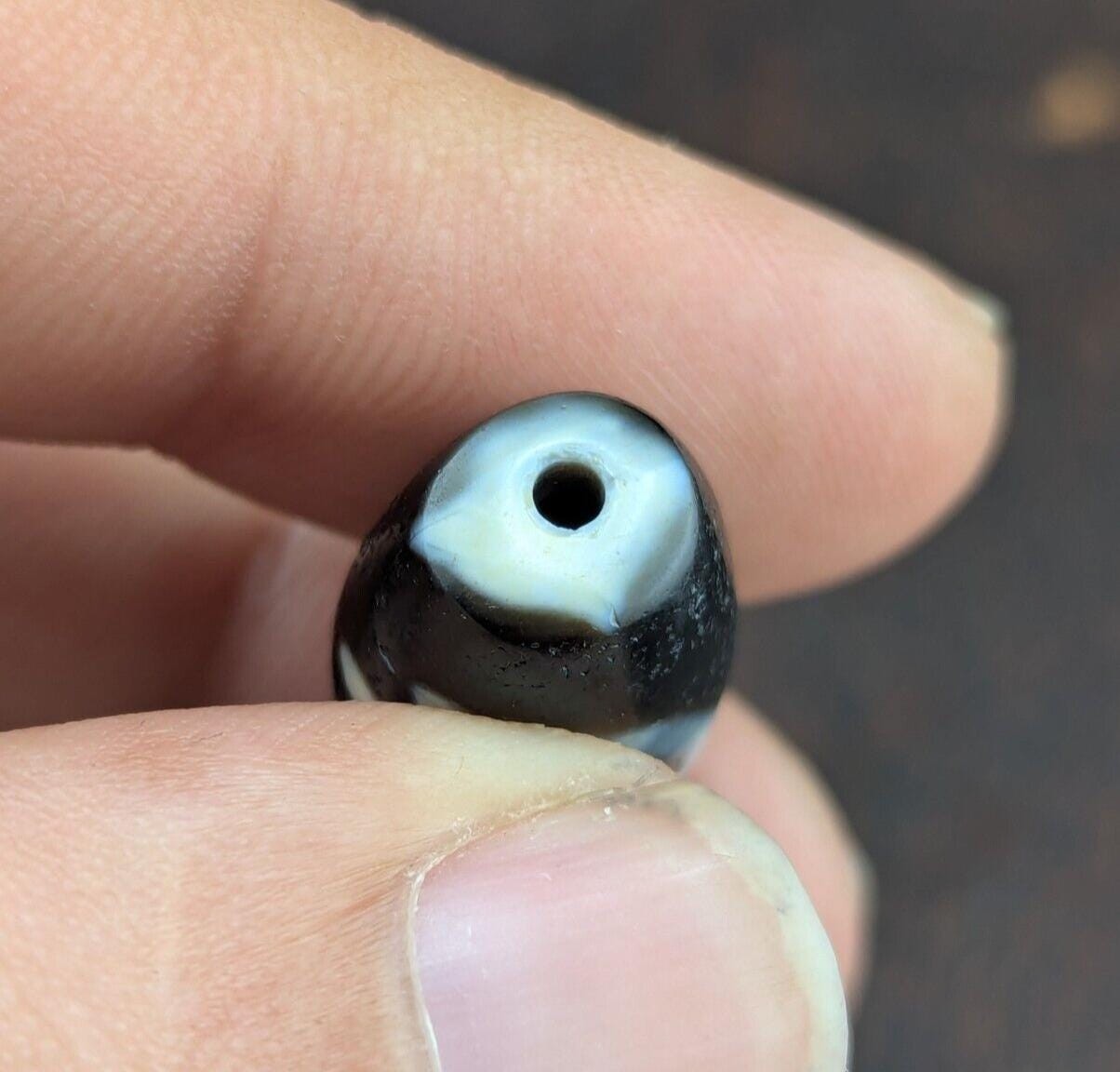 Questo amuleto vintage e realizzato in agata bianca e nera con un motivo unico Occhi, originario del Tibet. E una perlina DZI con un design distintivo, probabilmente utilizzata per scopi spirituali o protettivi.