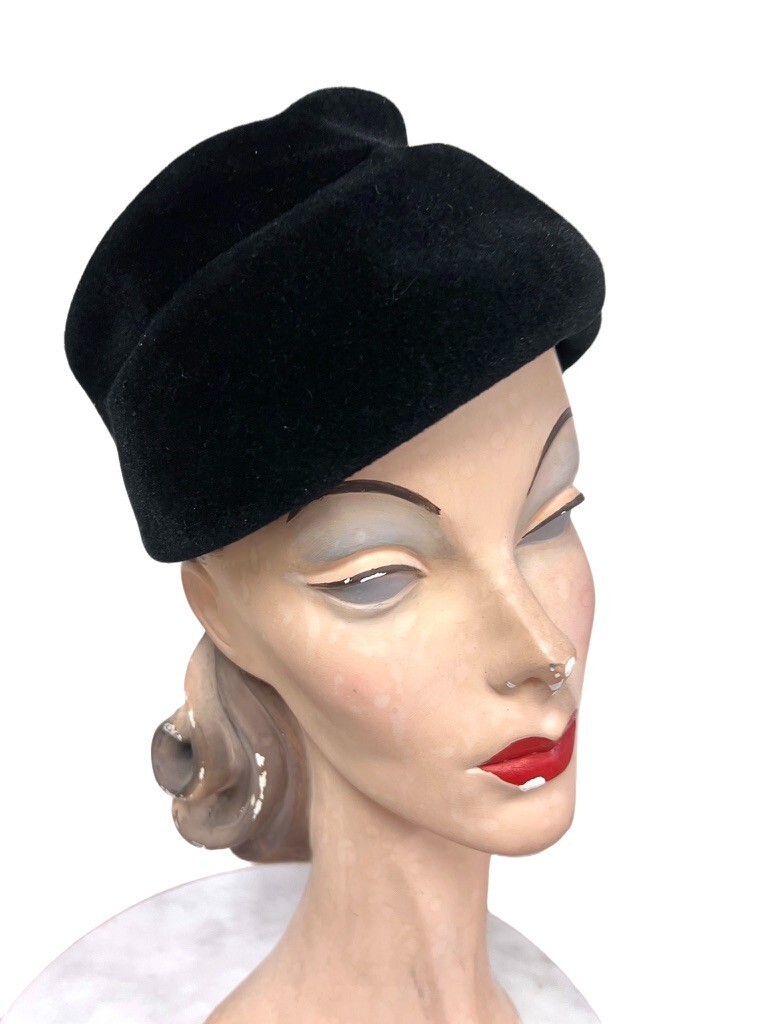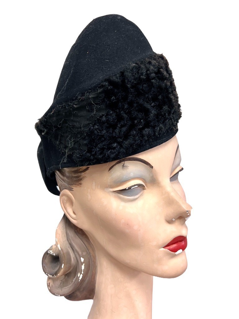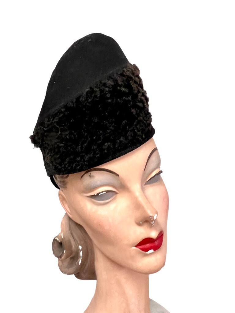 1940s Black and mouton fur tall fascinator- A striking hat, med-large head size.