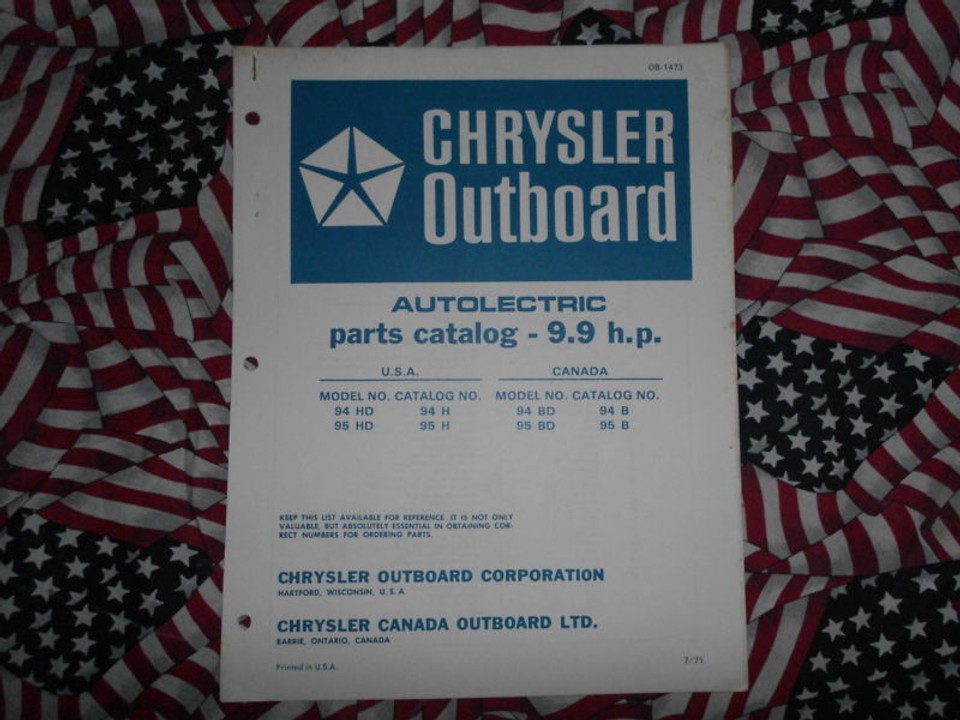 A 1971 Chrysler Outboard Autolectric 9.9 HP Parts Catalog. For Models 94 HD, 95 HD, 94 B, 95 B. What you see is what you will receive, we don't use stock