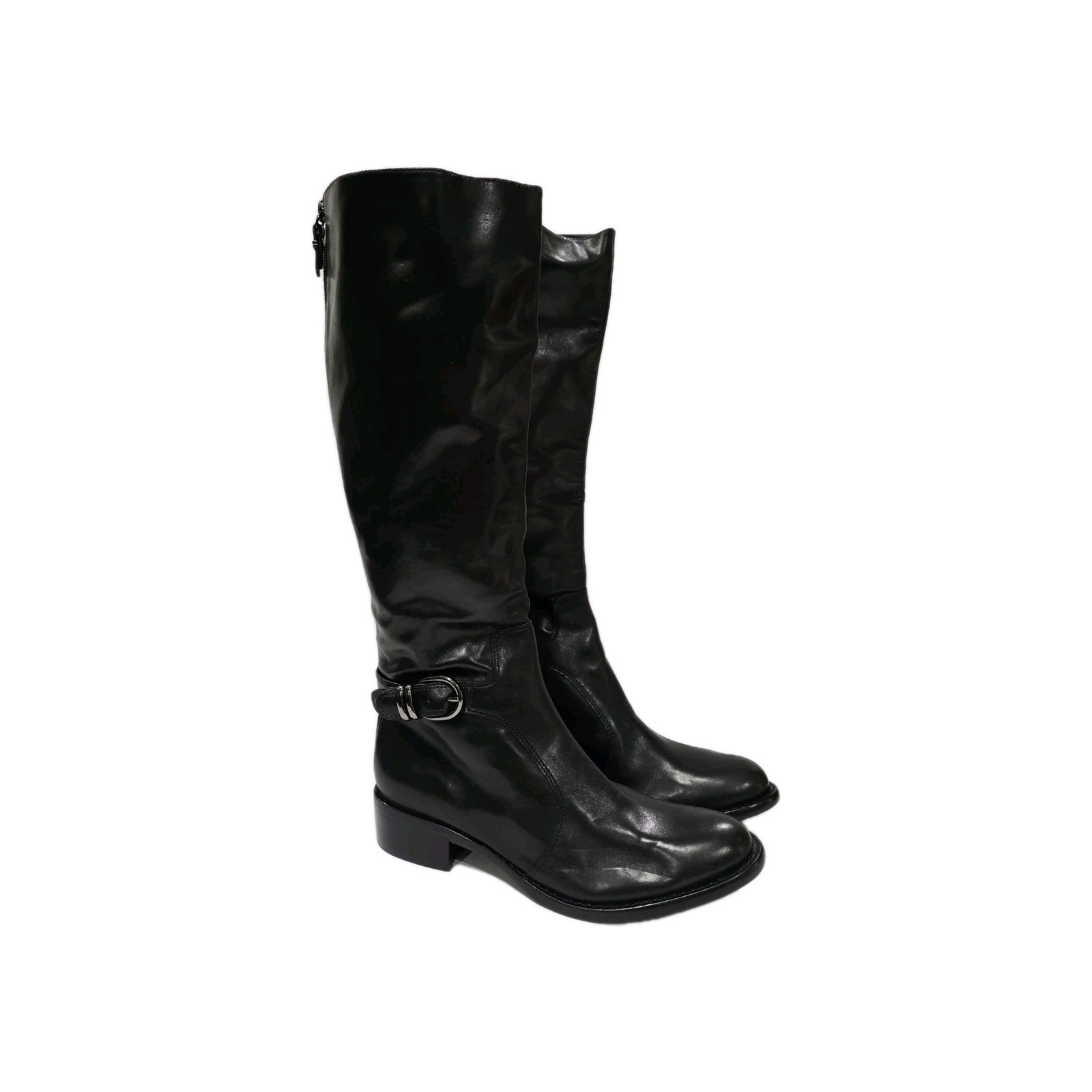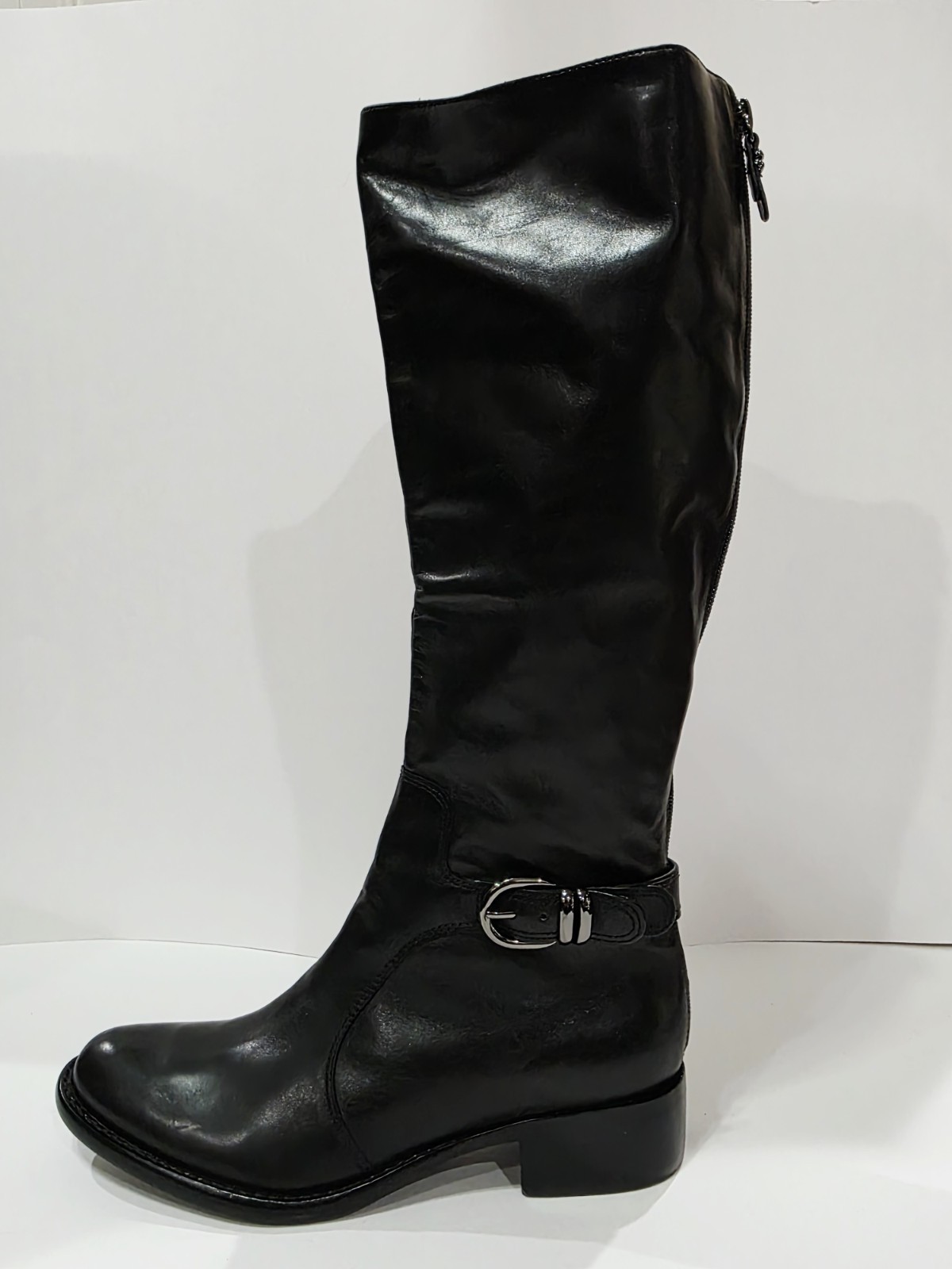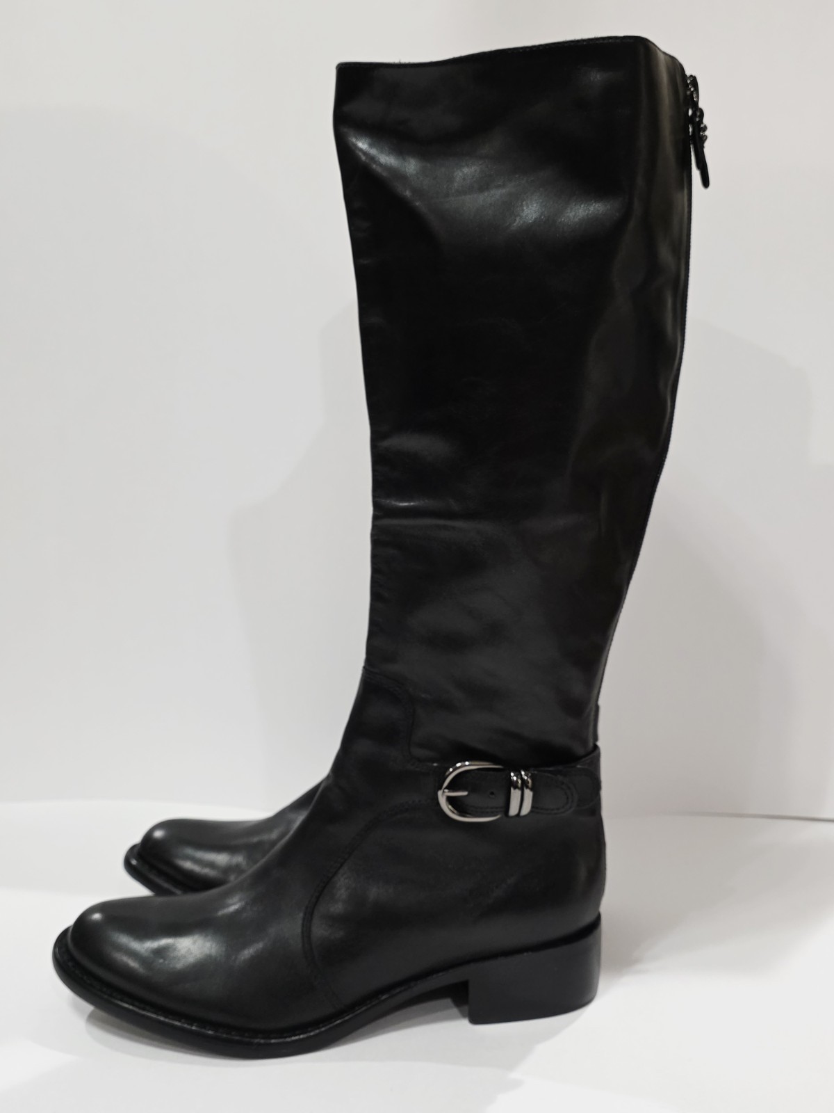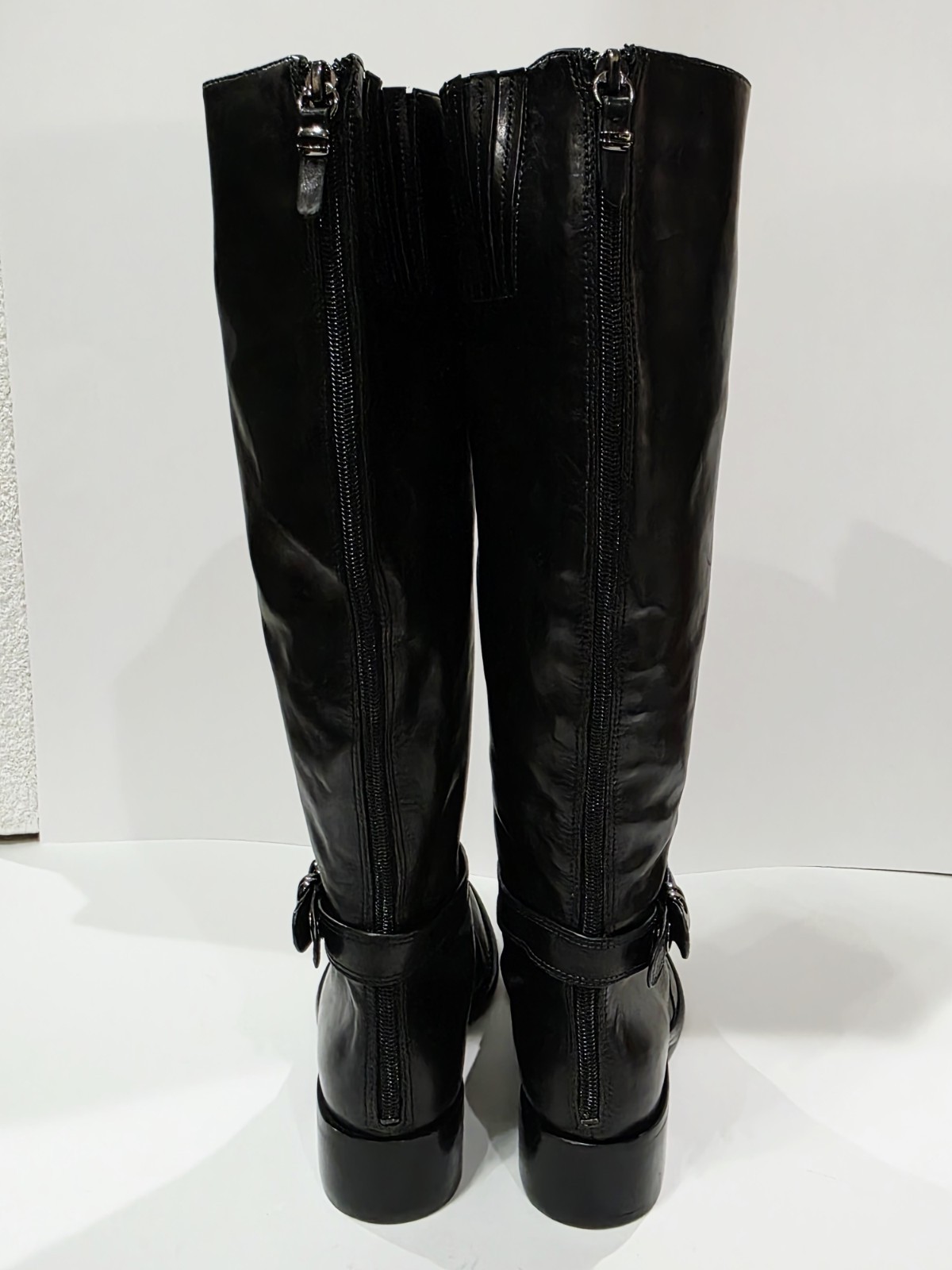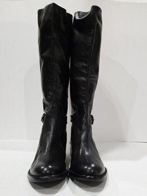 1 *Has 2 Small Holes on Bottom from Display* New Pair No Box By Via Spiga BLACK LEATHER Boot with Charcoal Harness and Upper Inner Stretch Knee High Zipper Riding 7 M New (Box #9)