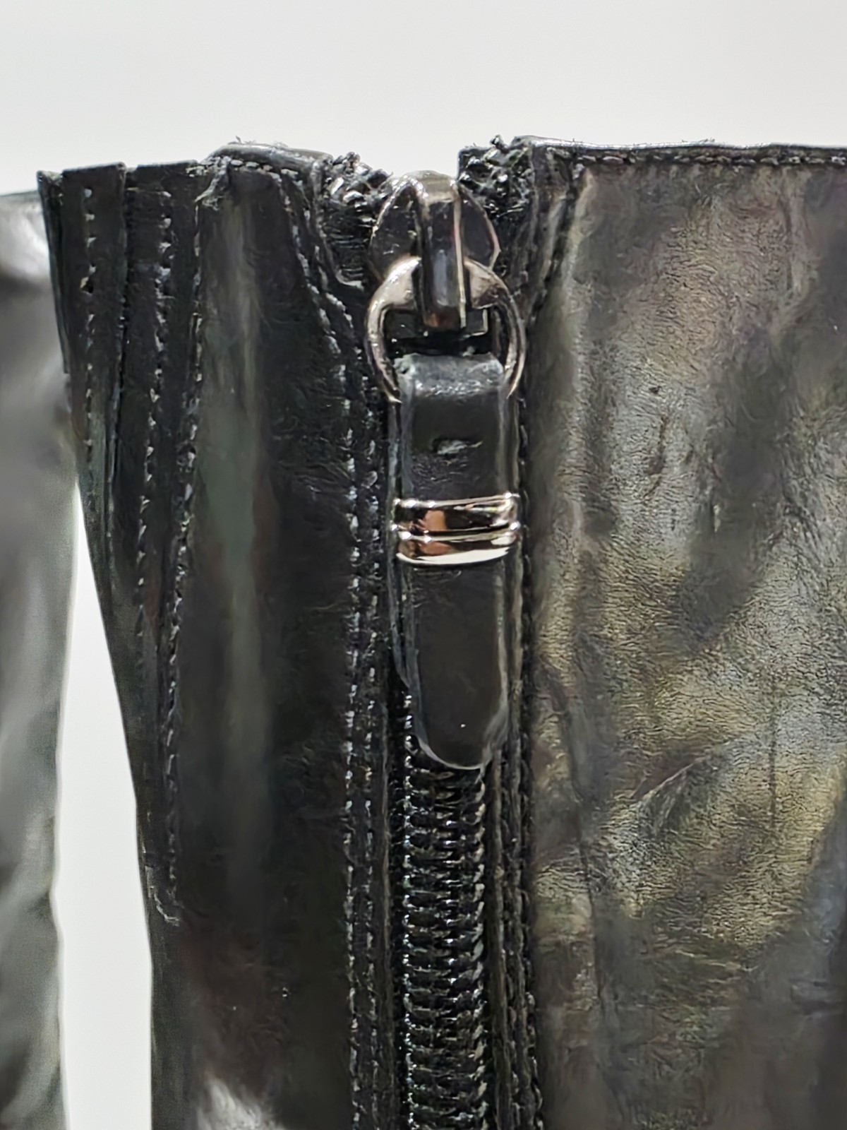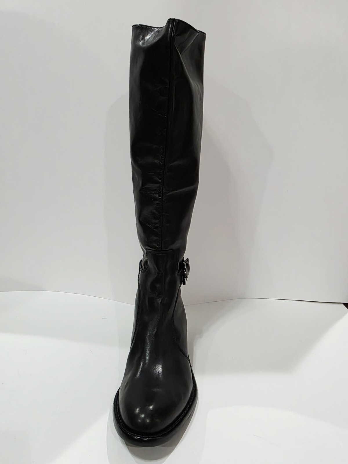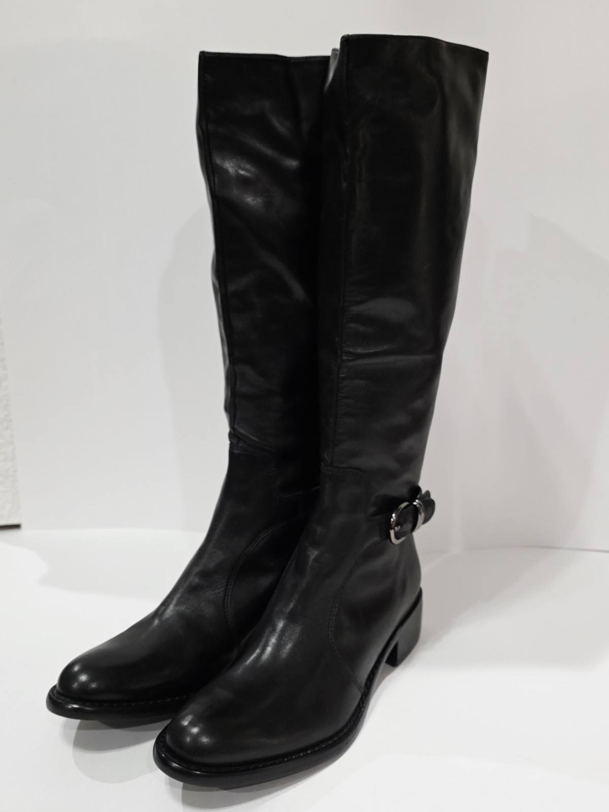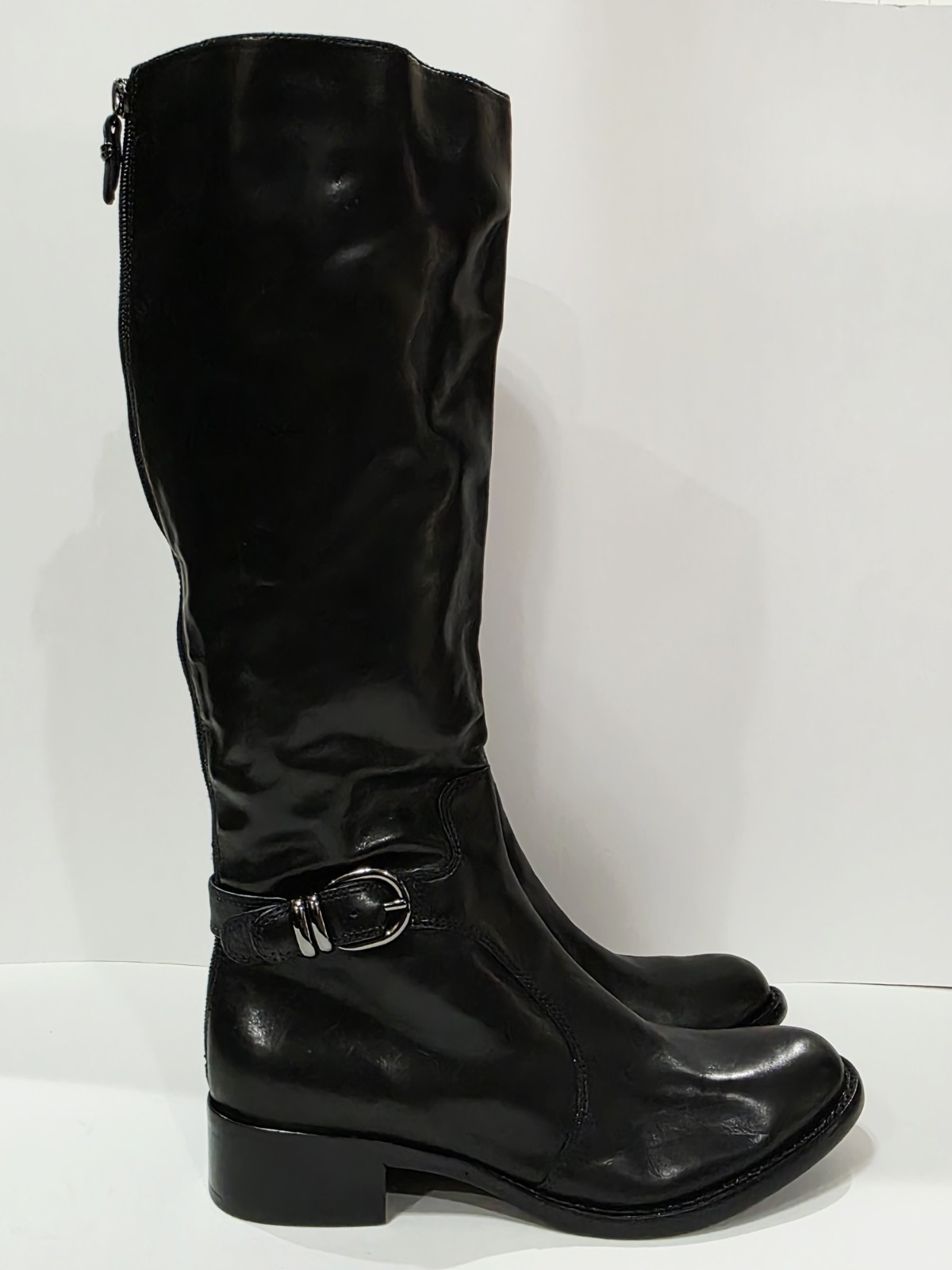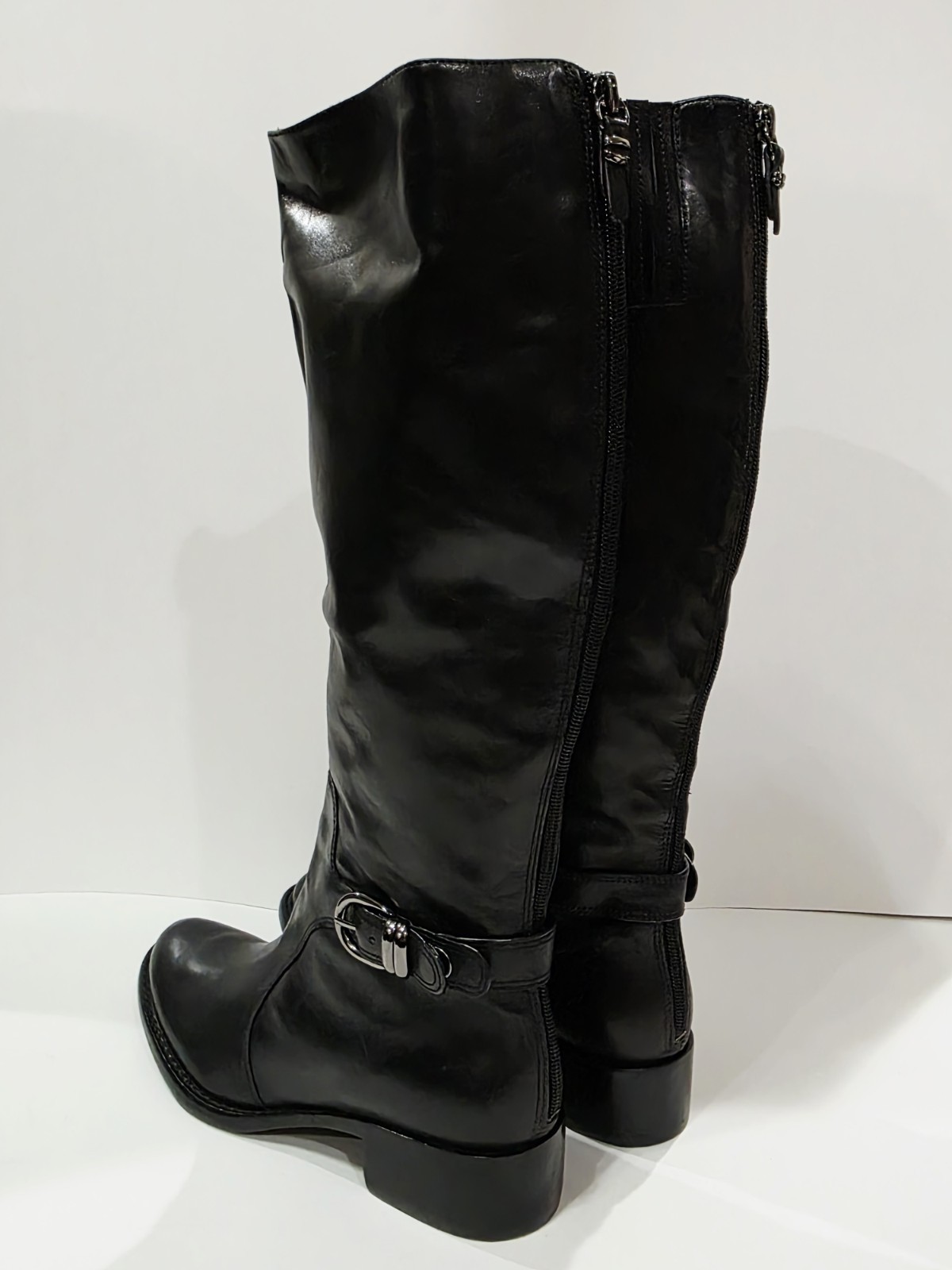 1 *Has 2 Small Holes on Bottom from Display* New Pair No Box By Via Spiga BLACK LEATHER Boot with Charcoal Harness and Upper Inner Stretch Knee High Zipper Riding 7 M New (Box #9)
