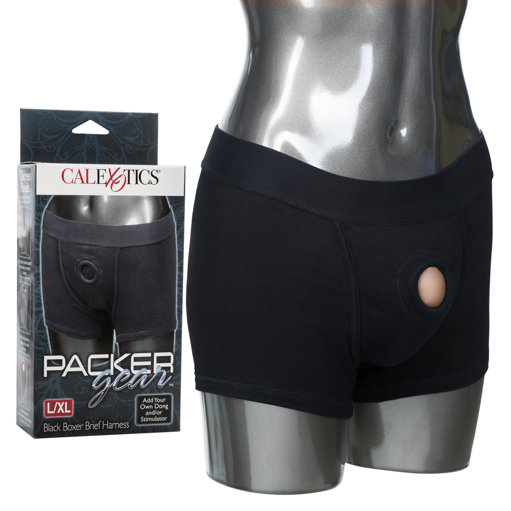 The Packer Gear Black Boxer Harness is made from stretchy and comfortable soft cotton/spandex and has a supportive extra wide waistband. The washable boxerโs soft lining has internal pockets, and an internal strap, to secure your preferred packer in place. The reinforced 2-panel design also features a super stretchy O-ring that easily accommodates most sizes of penetration tools.