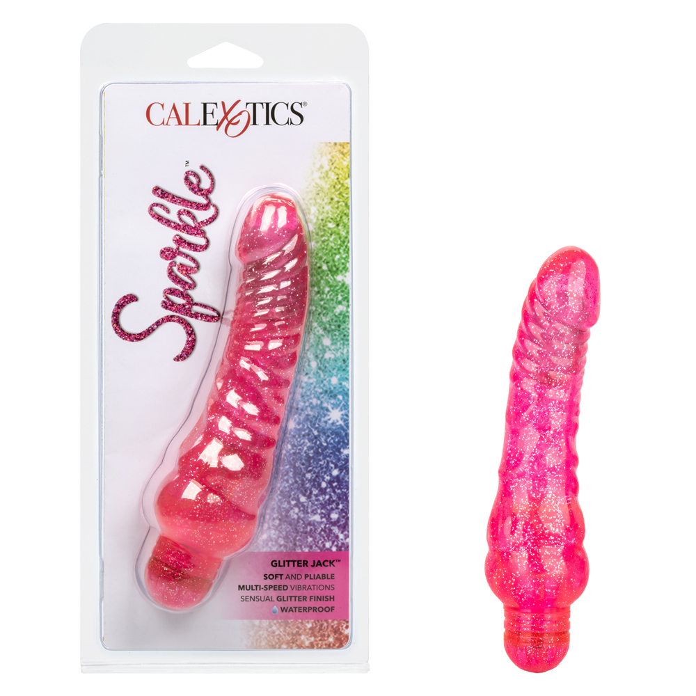 The Sparkle Glitter Jack vibrator delivers mind-blowing vibrations into a dazzling curved and ribbed package; With an easy-to-use vibration speed dial and waterproof design, this is an erotic toy box must-have for beginners and erotic adventurers alike. This high-powered massager is created with a flexible body to let you effortlessly control stimulation. Turn up the dial on the intense vibration motor and get playful as the vibe bends and flexes with your movements. Let your imagination run wild while the powerful vibrations buzz through the curved shaft. Increase the vibration intensity with the turn of a dial and send yourself spiraling into knee-shaking ecstasy. Whether youโre taking a dip with a lover or indulging in a steamy solo session, alluring adventure await you with this dazzling vibrator; Plunge into total ecstasy as this orgasmic vibe rubs, tickles and teases. The playful vibe is made from a smooth TPR plastic with sparkly glitter finish and ABS twist cap