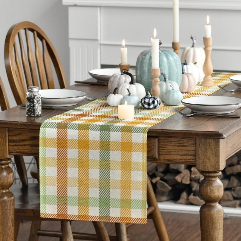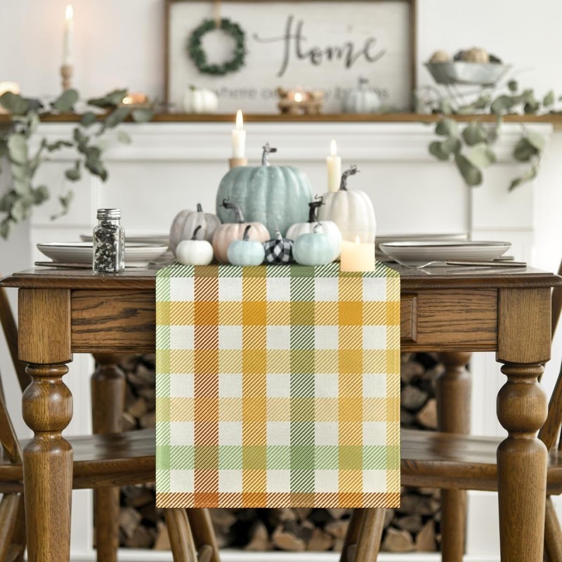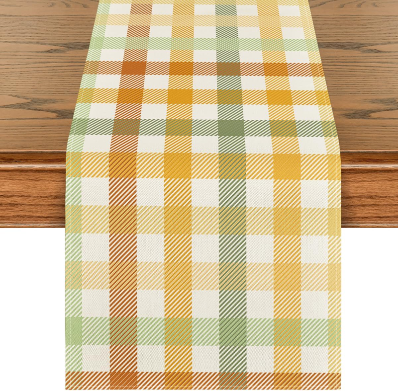Orange Green Buffalo Plaid Fall Table Runner, Autumn Thanksgiving Holiday Check Kitchen Dining Table Decoration for Home Party Decor 13X72 Inch