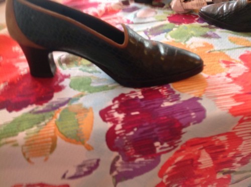 These shoes feature an almond toe box, forest green (please note the true color did not photograph well), croc stamped leather and a tan suede trim and back for added intrigue. They have a 2'' sturdy heel. Size 35. Made in Italy.