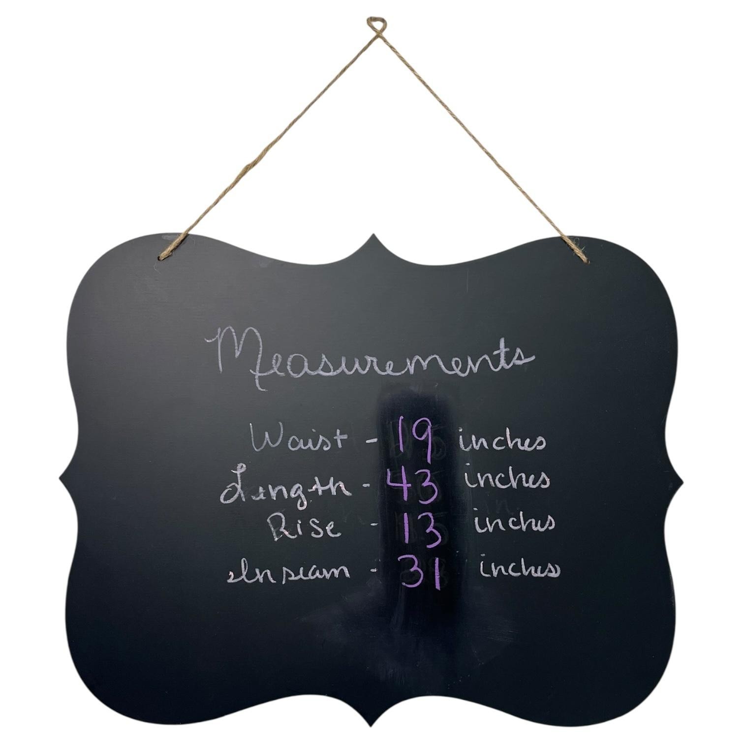 Measured from photos: Waist 19 in, Length 43 in, Rise 13 in, Inseam 31 in