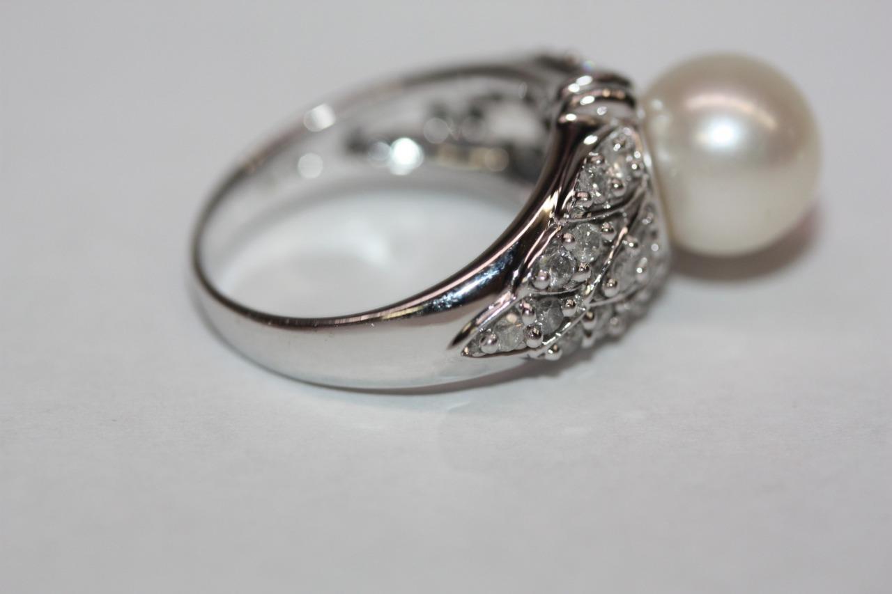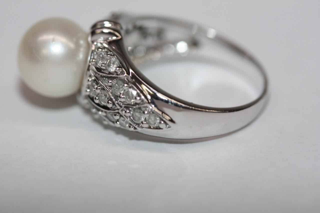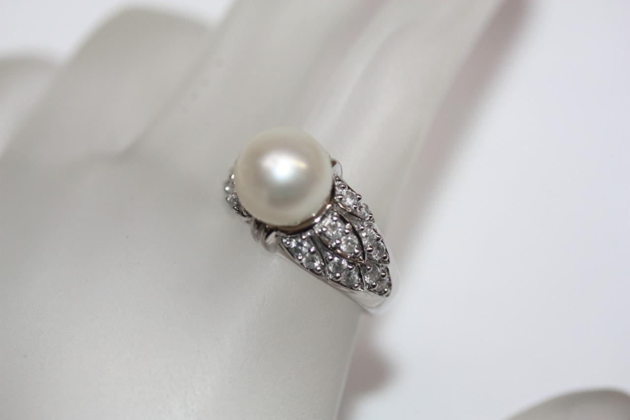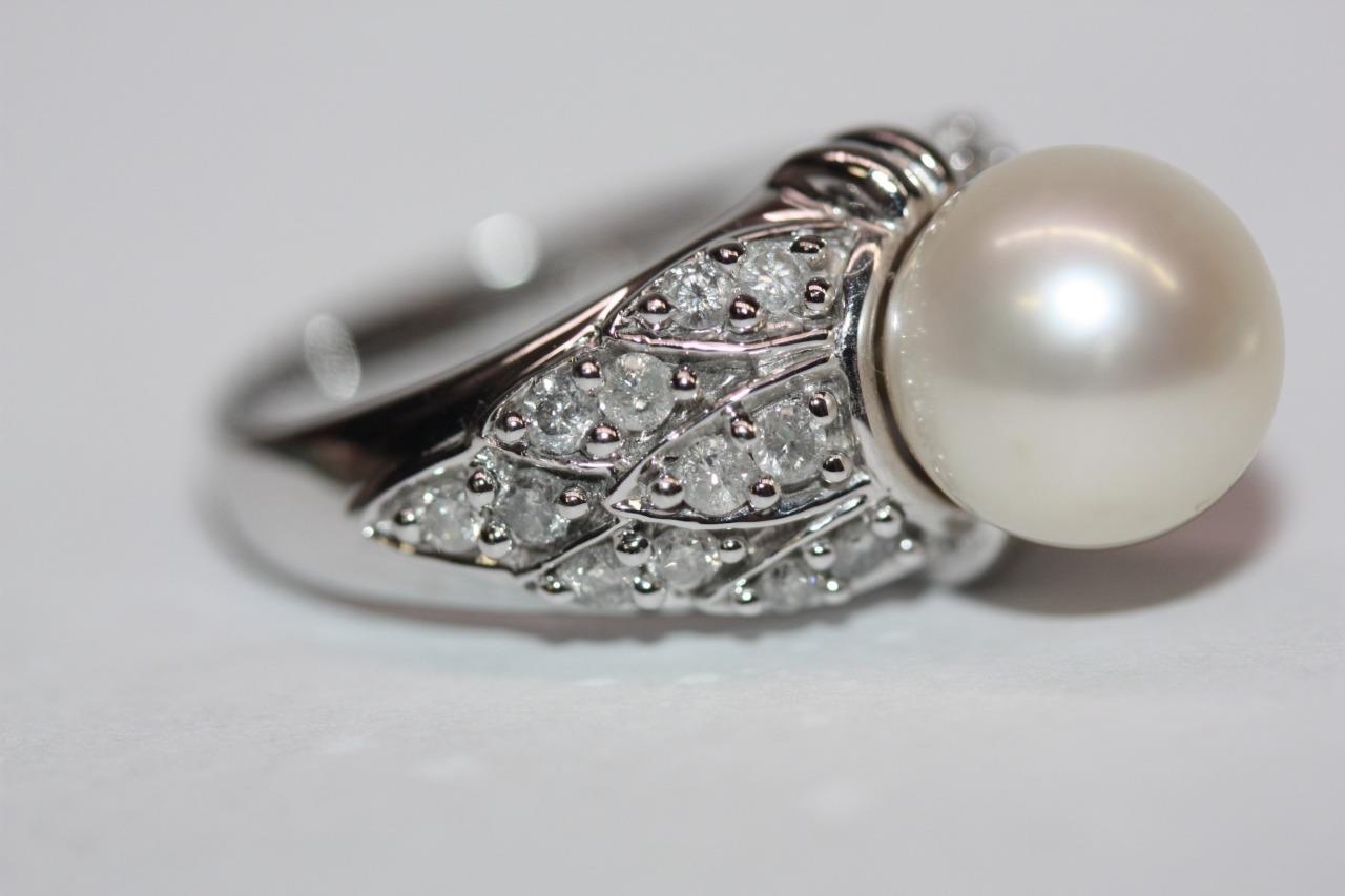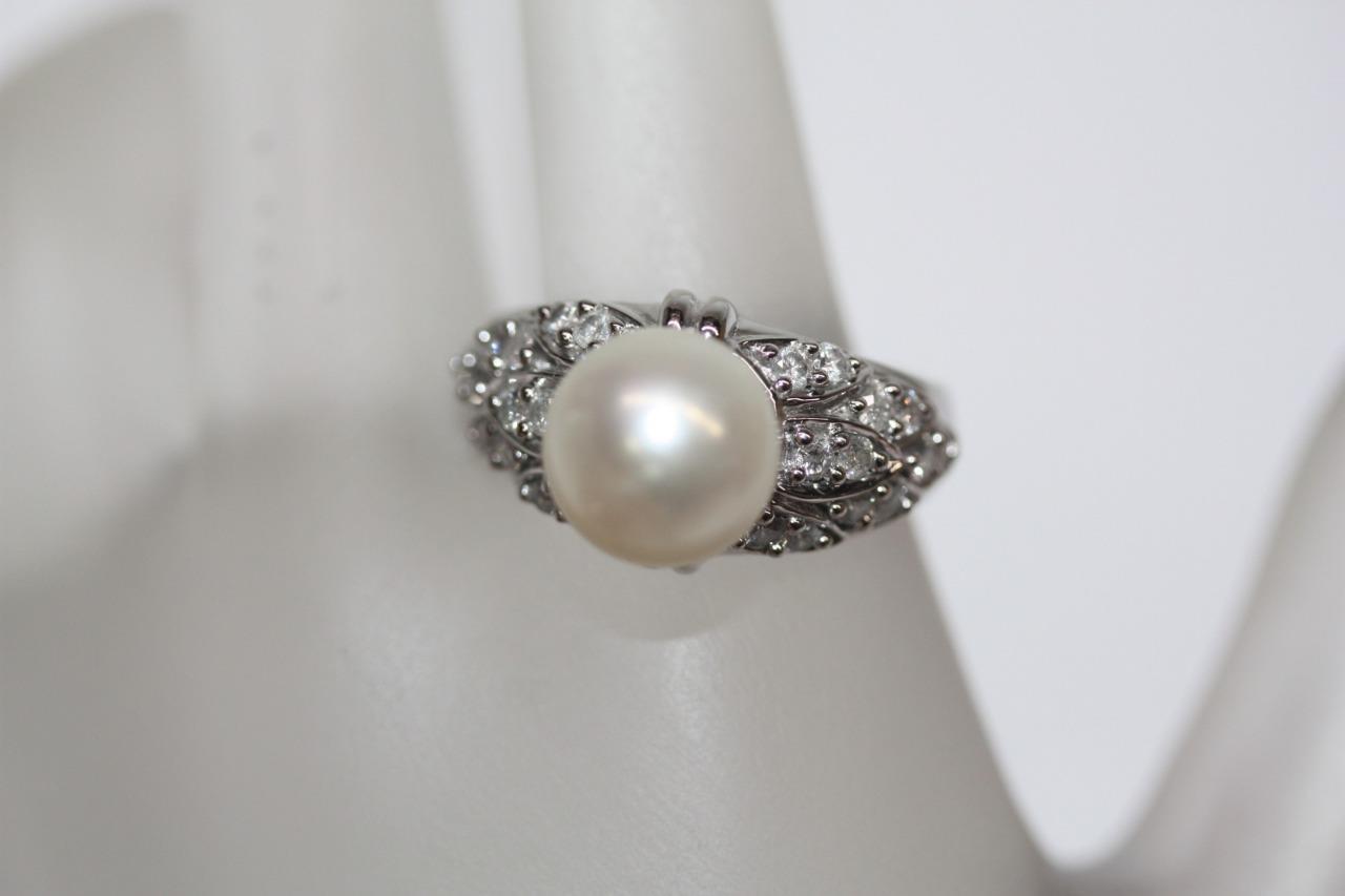 14K White Gold Round (9mm) White Pearl Diamond Accent Ring Size 7 (7.8 gr)