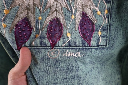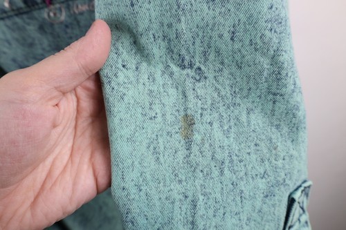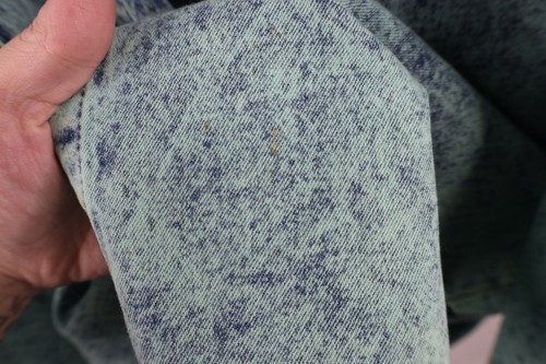 Inner collar discolored. Blemishes sleeves and front bottom. Embellishment peeling on right shoulder. . USA made