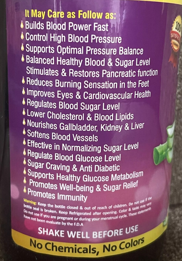This 16 oz tonic is formulated with a wide array of natural and organic components: Dong Quai, Mulberry, Berberine, Cinnamon, Fenugreek, Gymnema, Ginseng, Psyllium, Aloe Vera, Bitter Melon, Milk Thistle, Black Seed, Turmeric, Jamaican Black Castor Extract, Fiber, Barley, Chromium, Zinc, Basil, Apple Cider Vinegar, Sage, Ginkgo Biloba, Ashwagandha, Gotu Kola, Lemon Balm, Bacopa, Rosemary, Eleuthero Root, Lion's Mane Mushroom, Tulsi, Black Elderberry, Sea Moss, Echinacea, Goldenseal, Red Clover, Spearmint, Thyme, White Willow Bark, Senna Leaf, Ginger, Garlic, Celery Seeds, Parsley Extract, Cat's Claw, Bacopa Monnieri, Cardamom, and Alkaline Water.
