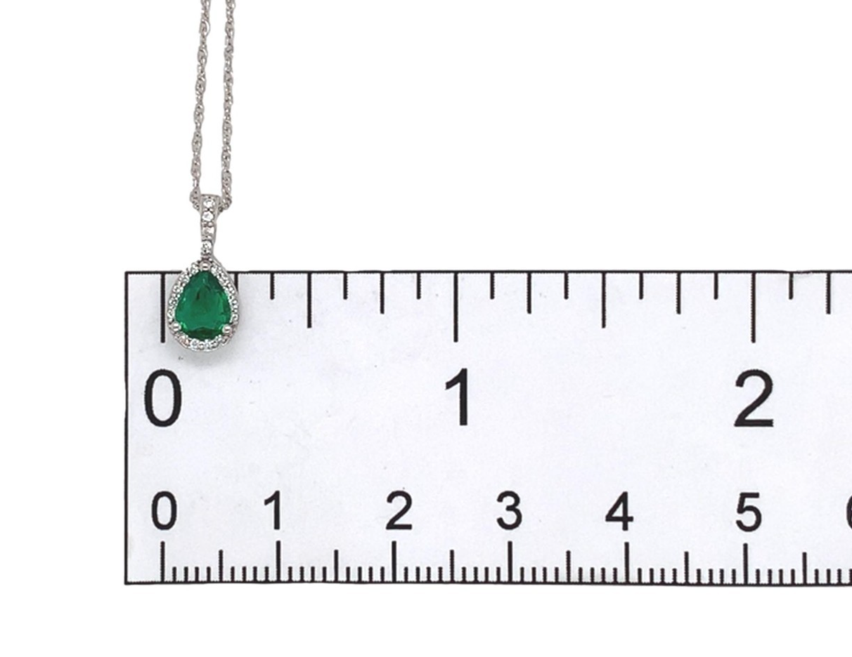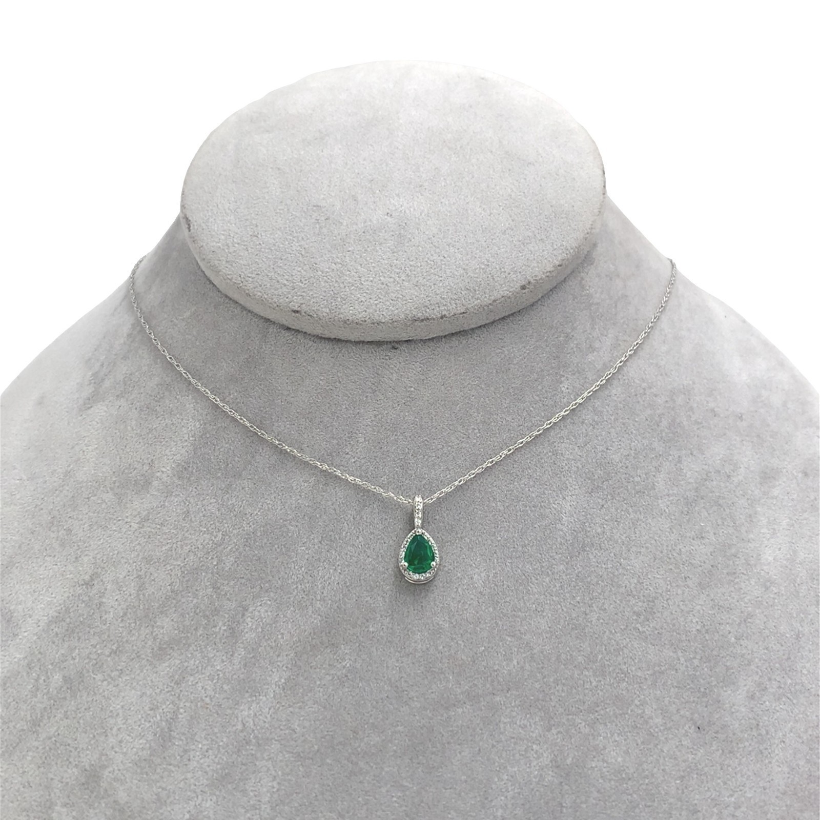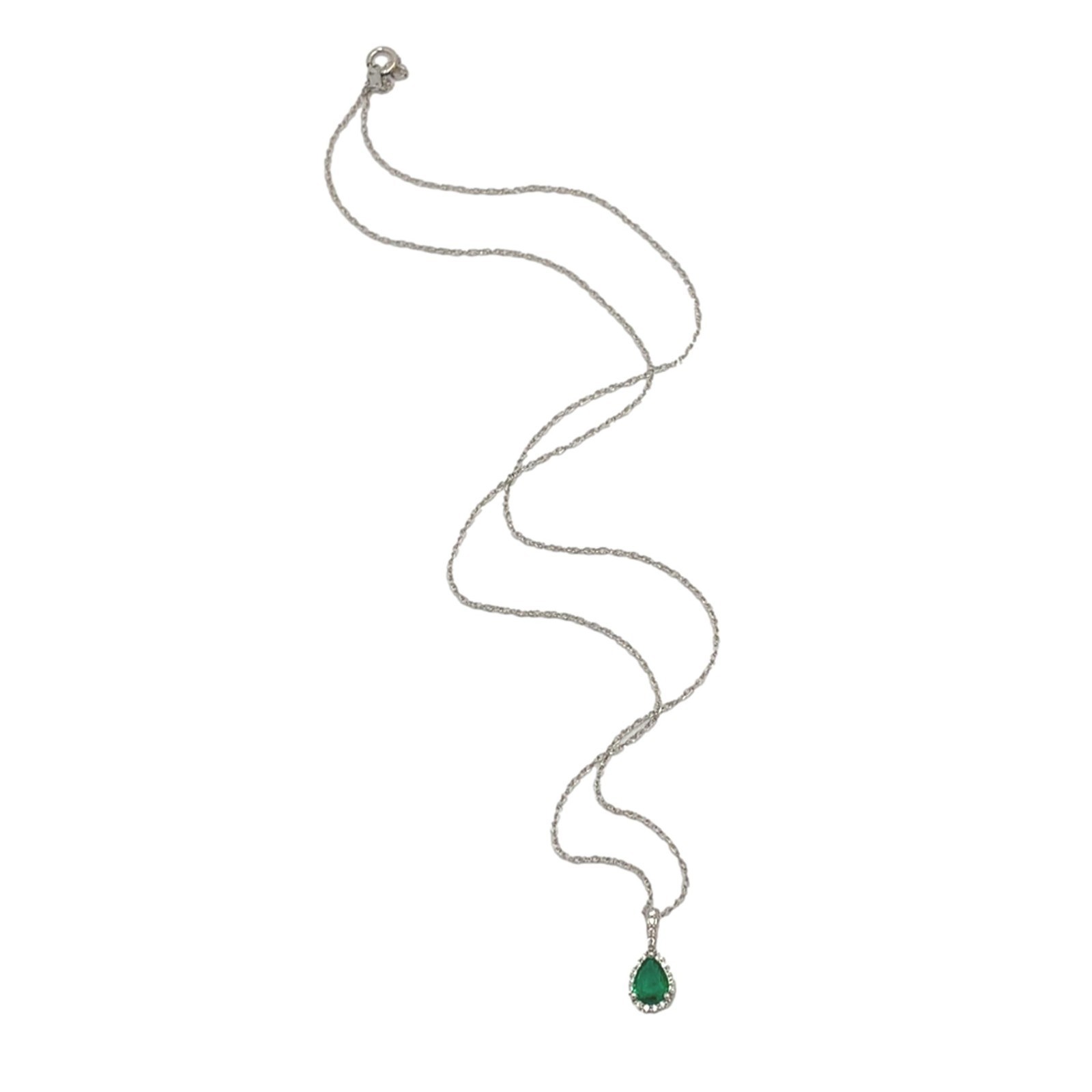 A platinum genuine earth mined emerald pendant with diamond halo. The pear cut emerald measures about 6mm x 4.7mm and has medium dark color and fine clarity. The emerald weighs .46 carats. There are nineteen tiny round diamond accents weighing .05cts total. The pendant measures about 1/2" long with bail and includes a new 18" platinum chain. The necklace weighs 1.55 dwt., and is new. Beautiful!