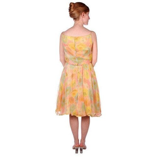 Vtg 1965 silk chiffon party dress from Saks Fifth Avenue, light as air in sherbet pastels of yellow, pink, and aqua. Features yellow satin ribbon straps, full taffeta lining, darted blousy bodice, and very full skirt with a contrasting pink belt backed in aqua. Back zipper closure.