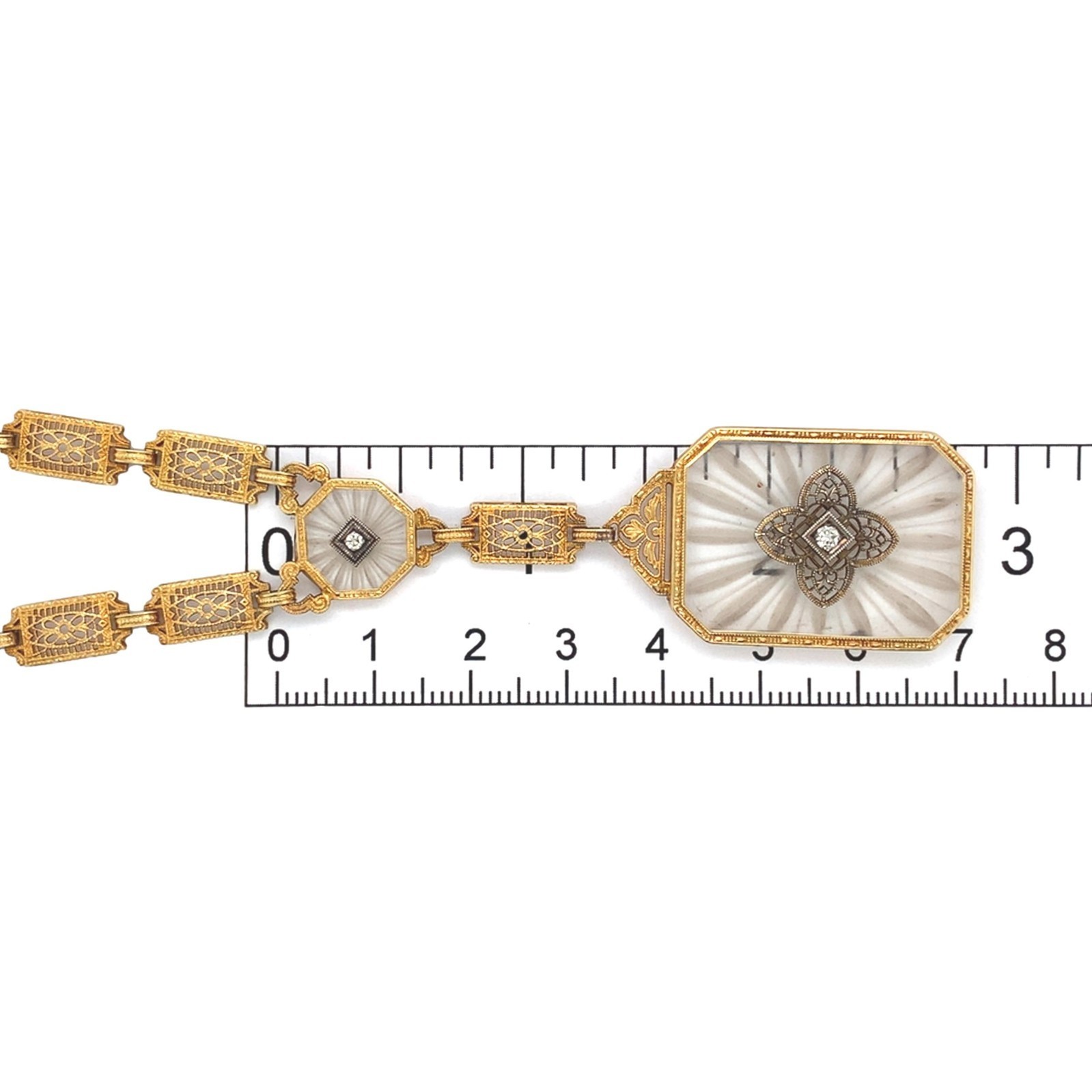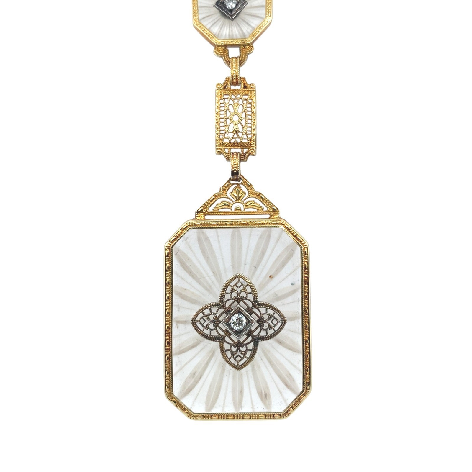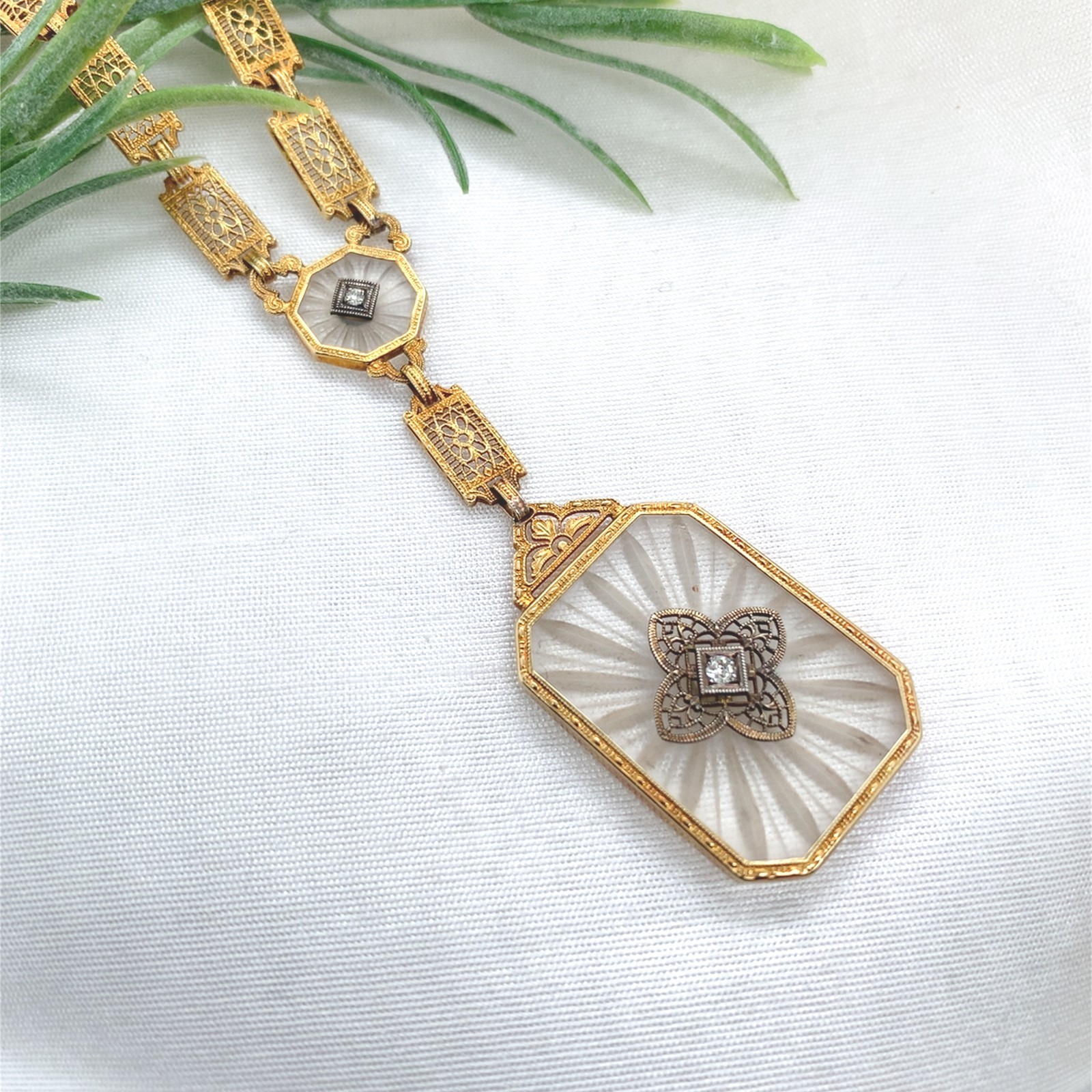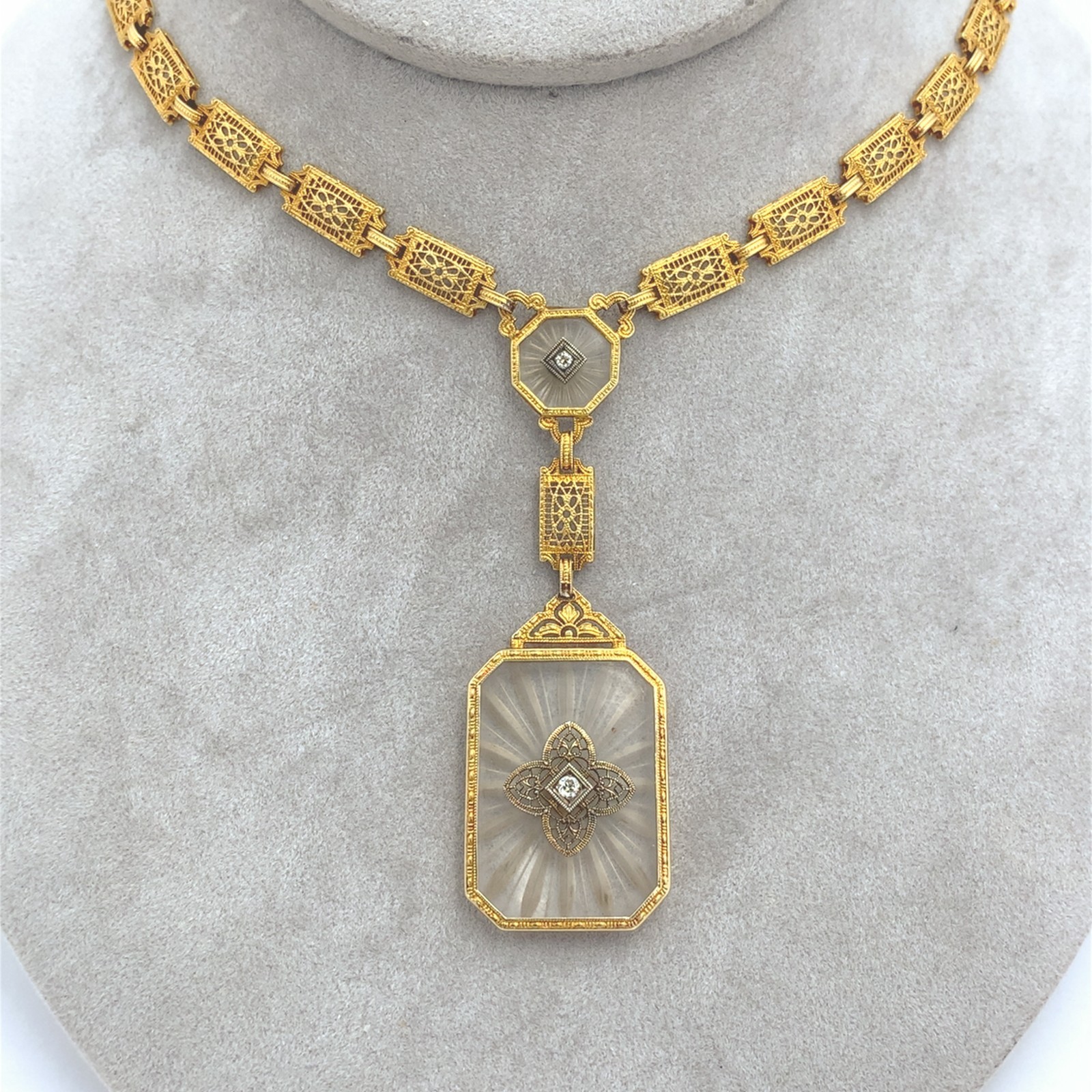 Art Deco 14k yellow gold necklace featuring a large beautiful frosted and reverse carved rock crystal quartz panel. The large rectangular crystal measures about 30mm x 22mm, and is accented with a small round diamond measuring about 2.2mm. There is a smaller eight sided rock crystal measuring about 11.5mm, with a small round diamond measuring about 1.9mm. The diamonds are set in white gold.
