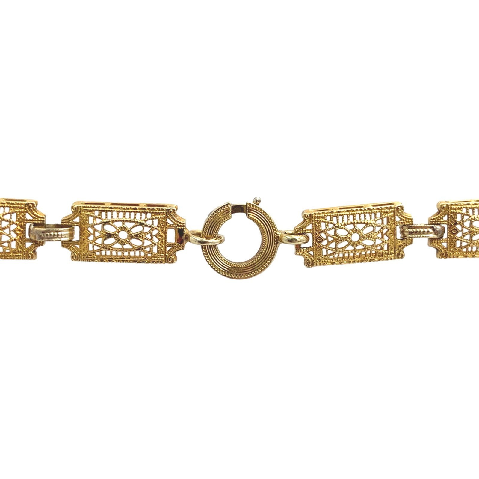 The chain is made of rectangular filigree links measuring about 6.3mm wide. The wearable length is 22". The center pendant with bail and link measures 2 2/4" long; the pendant measures 7/8" wide. Stamped 14k on the clasp and ring opposite the clasp. The necklace weighs 16.91 dwt., and dates from the 1920s. Captivating!