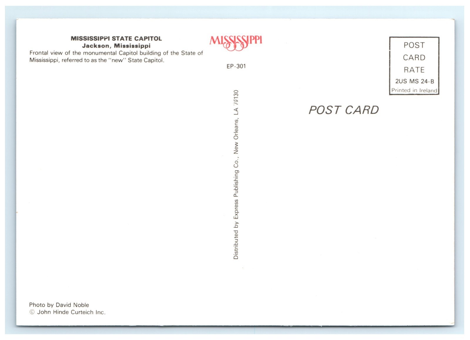? Back: Unused. Distributed by Express Publishing Co., New Orleans, LA. Photo by David Noble. John Hinde Curteich Inc. Card number EP-301. Printed in Ireland.