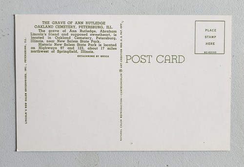 Vintage Divided Back Chrome Postcard Featuring the Grave of Ann Rutledge in Oakland Cemetery Located in Petersburg Illinois. Ann Rutledge was the Friend of Abraham Lincoln.