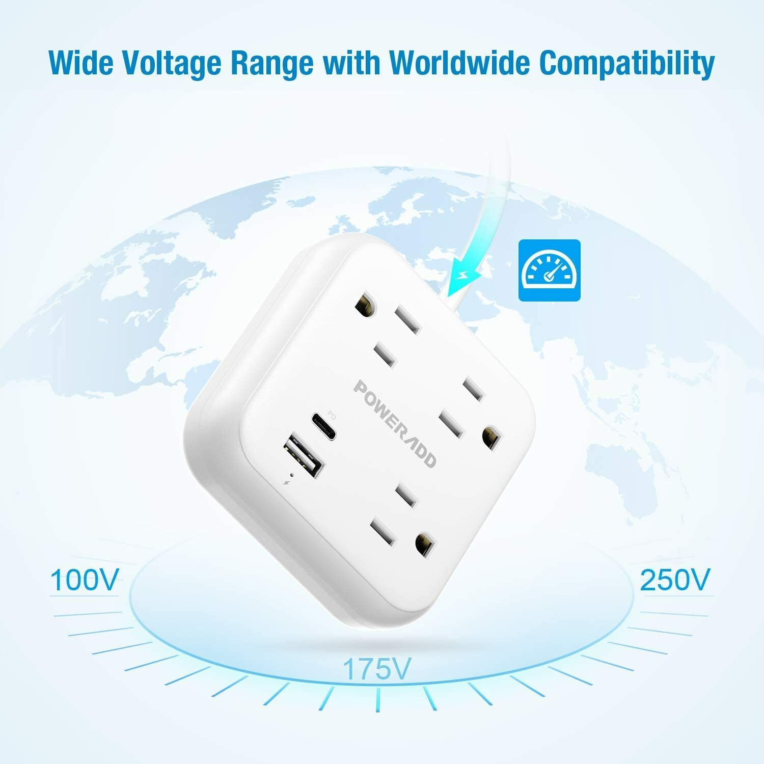 ?Multiple Outlets Power Strip? Multiple plug power strip, 3 AC outlets, Fast Charging 18W Power Delivery USB C Port x 1 and Quick Charge 3.0 USB-A Port x 1, provides power for 5 devices simultaneously. Rated Power: 1250W (125V/10A). Input Voltage: 100V-250V.