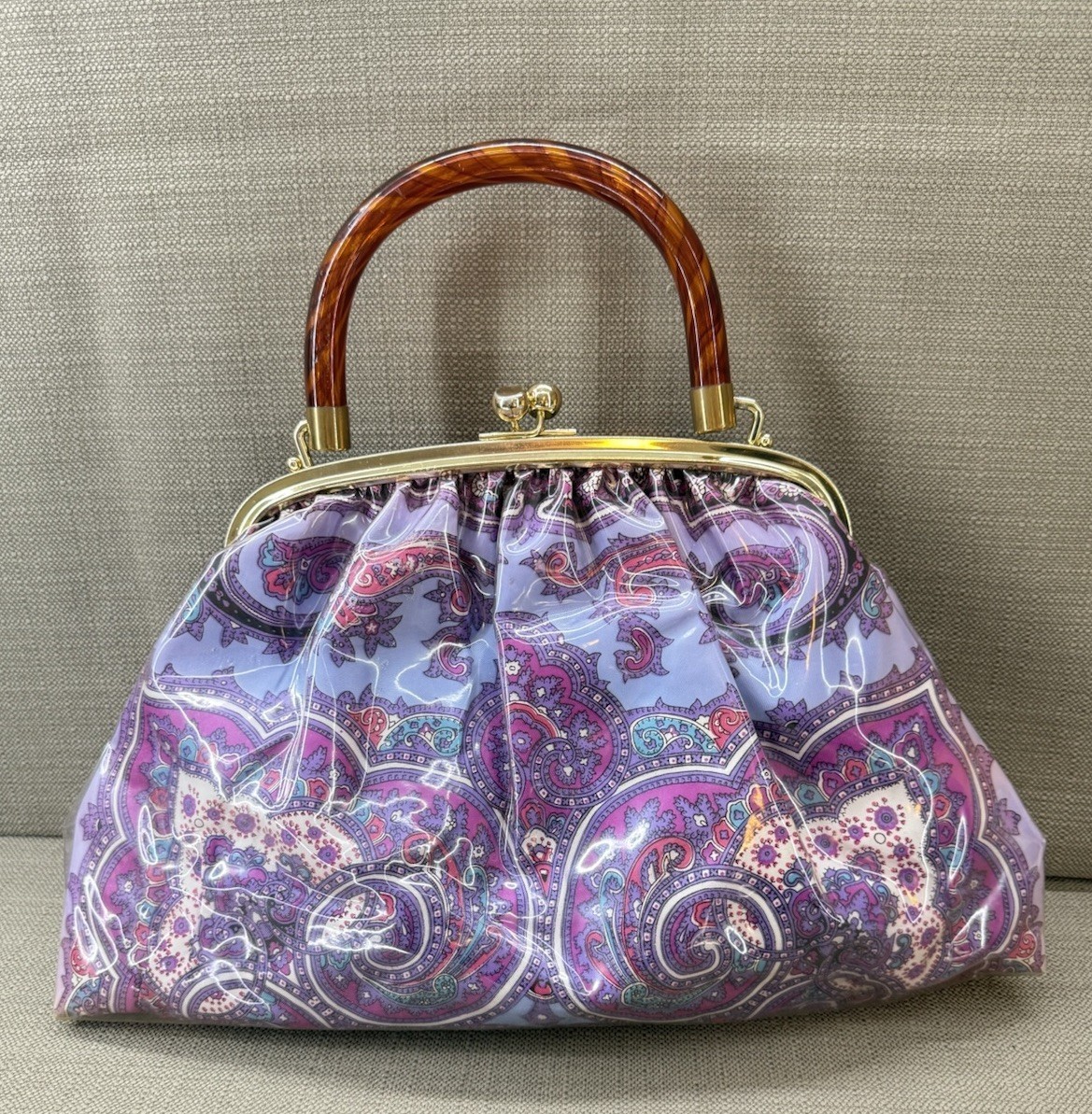 This vintage 50s?60s satchel handbag features a bold floral paisley print protected by a clear plastic cover, giving it both style and durability. The bag includes a sturdy Bakelite handle, a classic mid-century detail that makes it stand out as a collectible accessory.