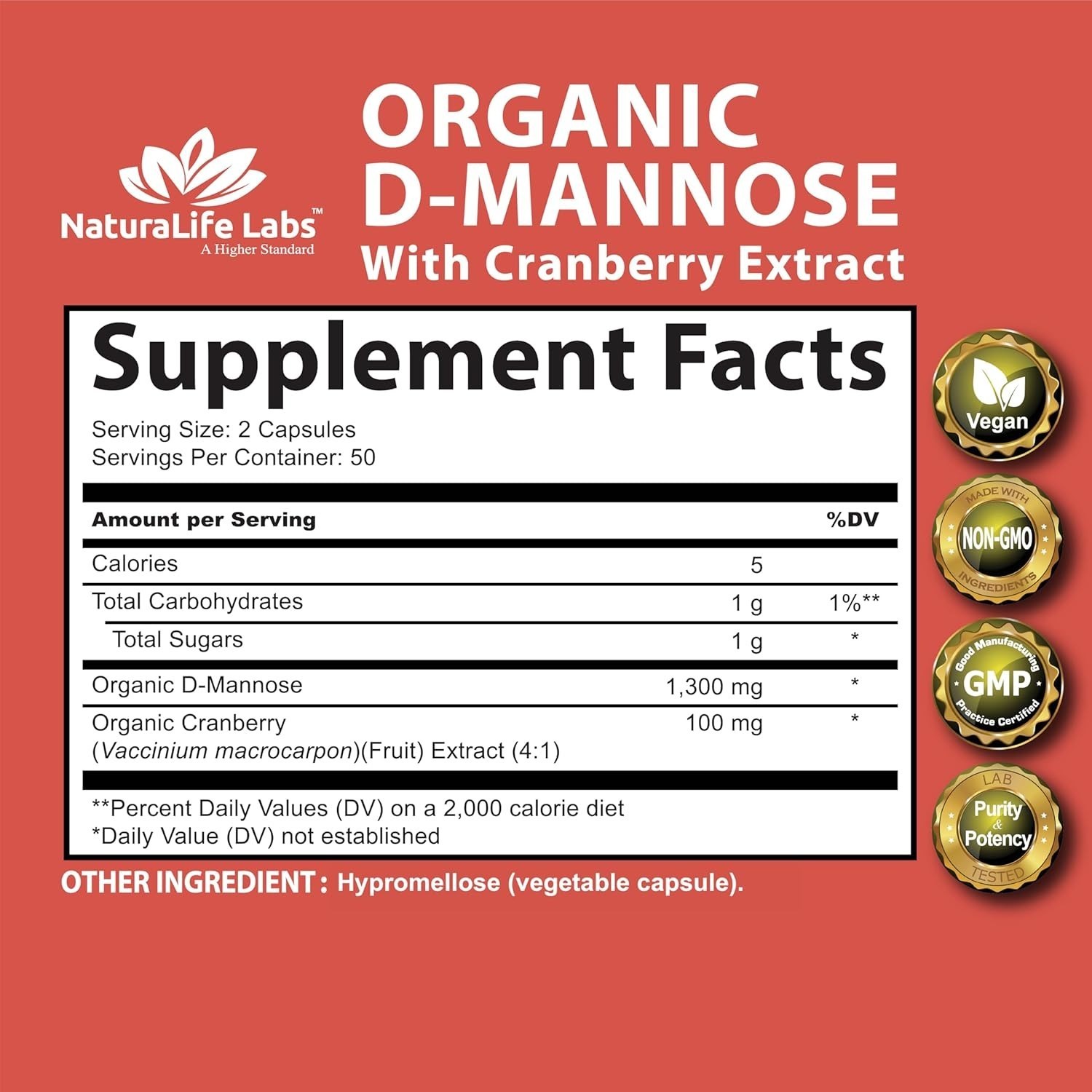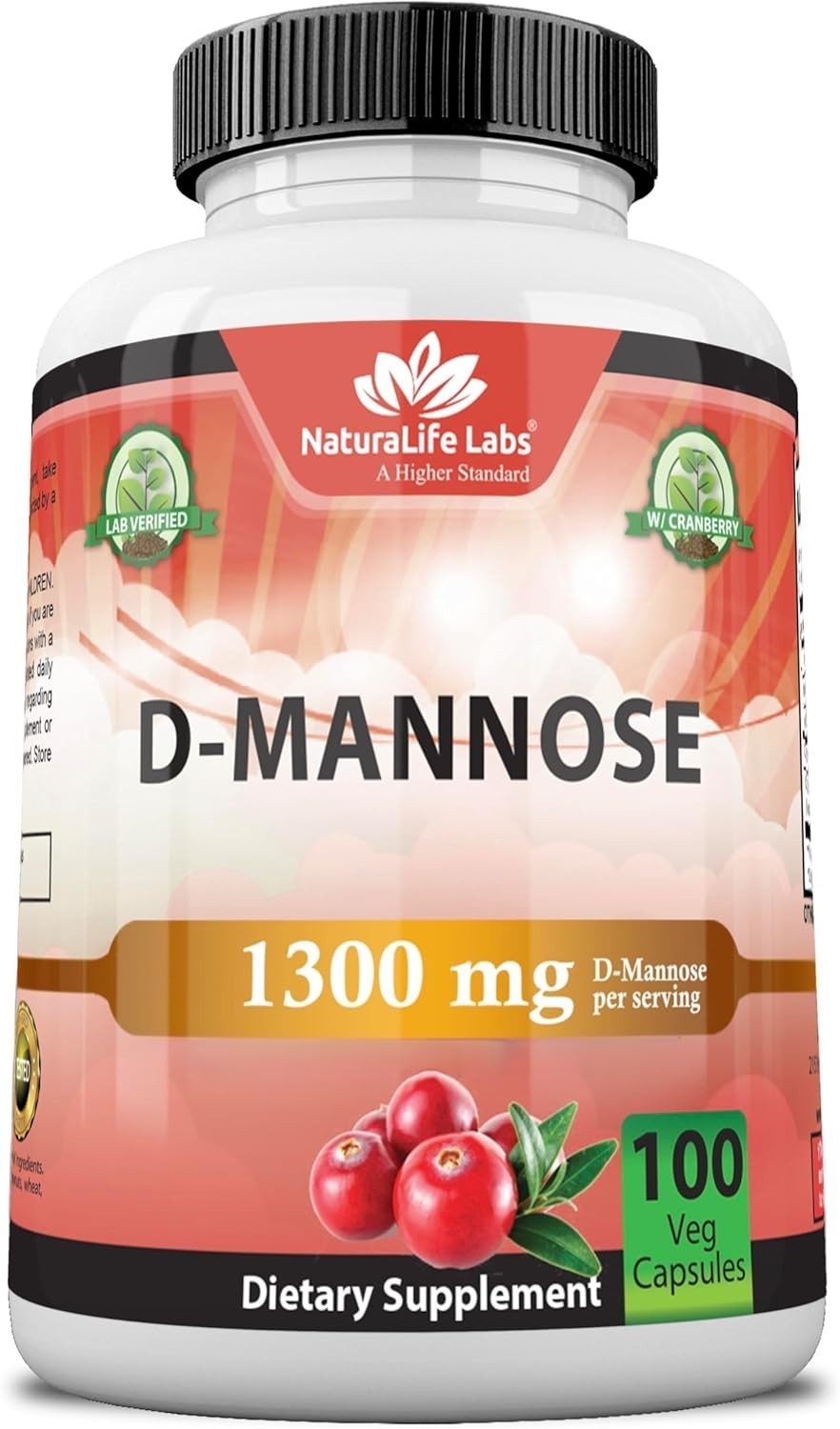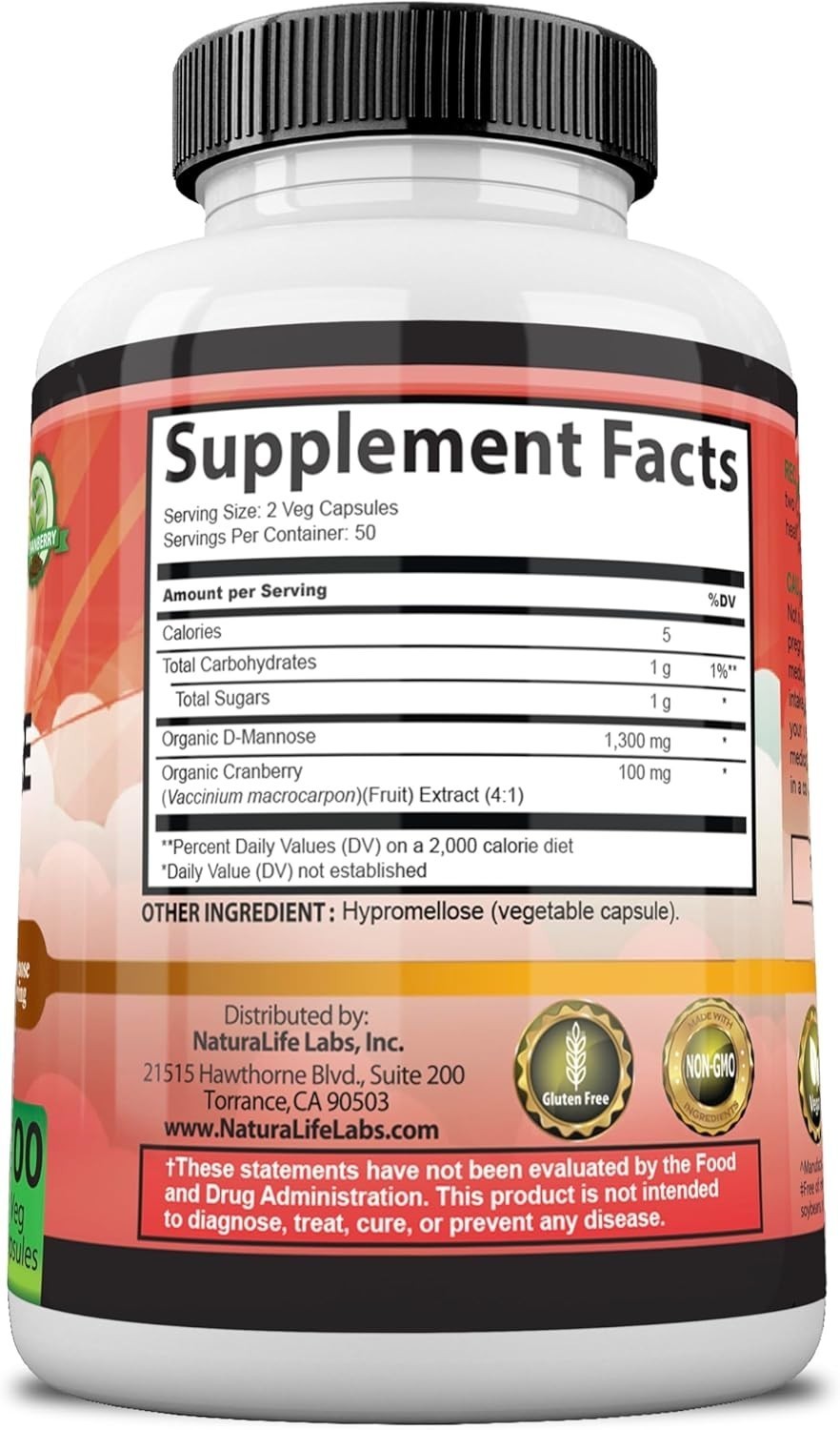 NaturaLife Labs Organic D-Mannose 1300mg with Cranberry Extract 100mg - Urinary Tract Support, Non-GMO, Gluten-Free, 100 Vegan Capsules