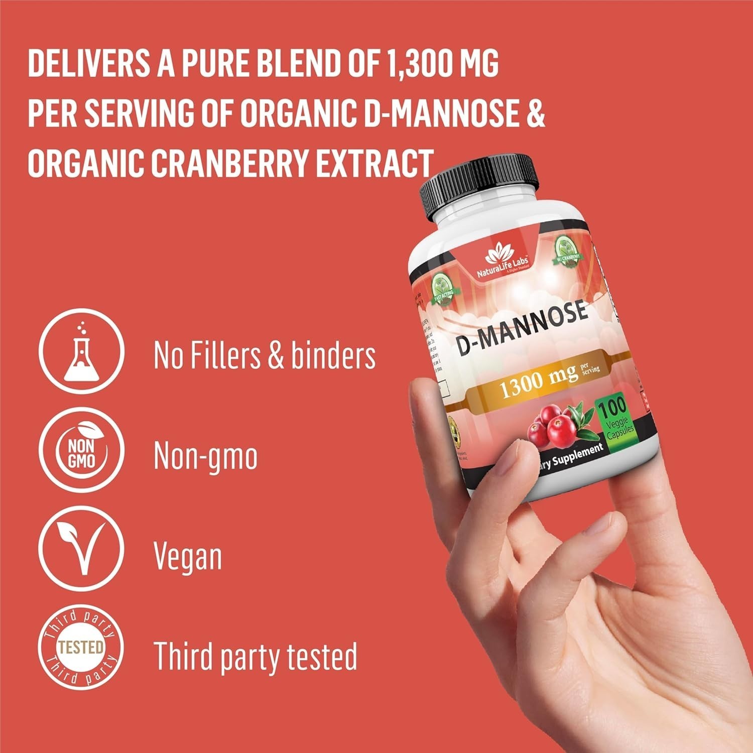 Contains pure D-Mannose and cranberry extract without fillers or binders, sourced from carefully audited suppliers.