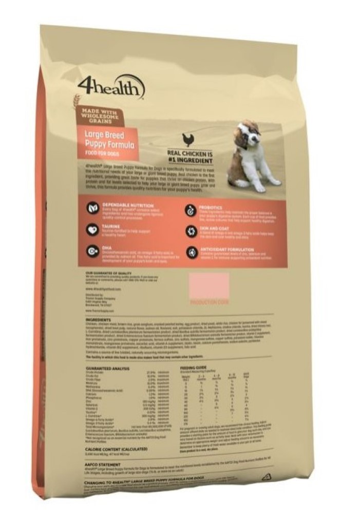 This sale transaction is for a 4health 9906 Wholesome Grains Large Breed Puppy Chicken Formula Dry Dog Food 18 lb. Bag, included exactly what is pictured.