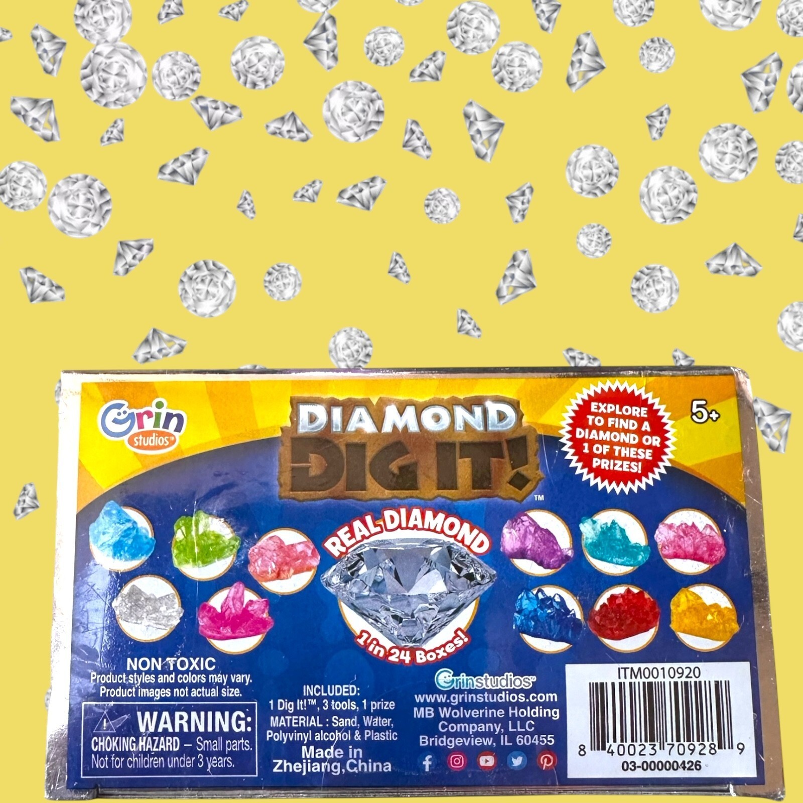 Authentic Brand New Sealed from Manufacture Super Diamond Dig It Kit. 1 in 24 boxes have a real diamond!!! Increase your opportunities to discover a real DIAMOND in your kit, by getting it here. Limited supply!! Get Yours Today!!!