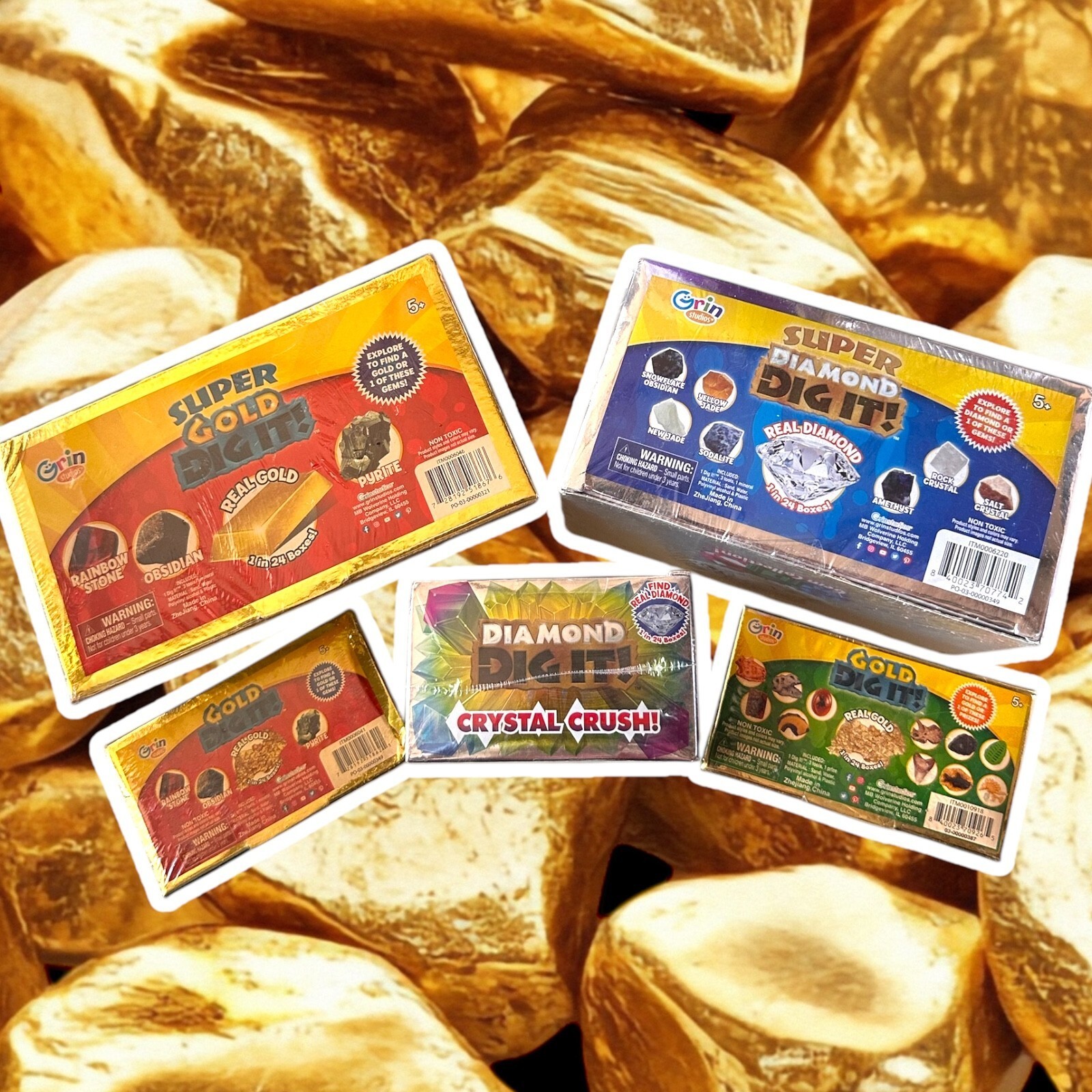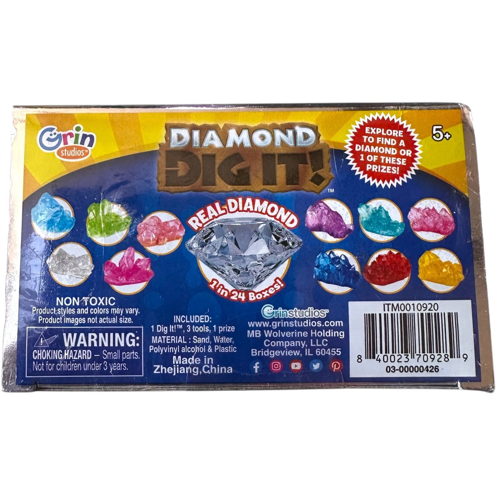 Authentic Brand New Sealed from Manufacture Super Diamond Dig It Kit. 1 in 24 boxes have a real diamond!!! Increase your opportunities to discover a real DIAMOND or GOLD in your kit, by getting it here. Limited supply!! Get Yours Today!!!