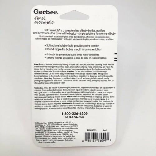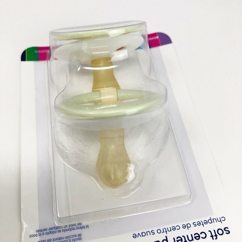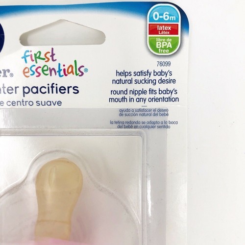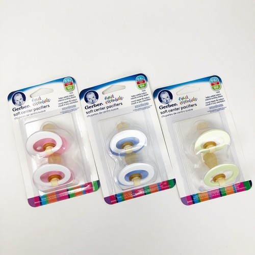 Keep your baby calm and satisfied with Gerber First Essentials Soft Center Pacifiers, 0 to 6 Months. This item is specially designed for newborns and helps sate your little one's natural sucking desire. It's made with a soft, natural rubber bulb to provide added comfort. The round nipple is designed to fit your baby's mouth comfortably in any orientation. These latex pacifiers are BPA-free, making them safe to use. You will receive one pack containing two pacifiers.