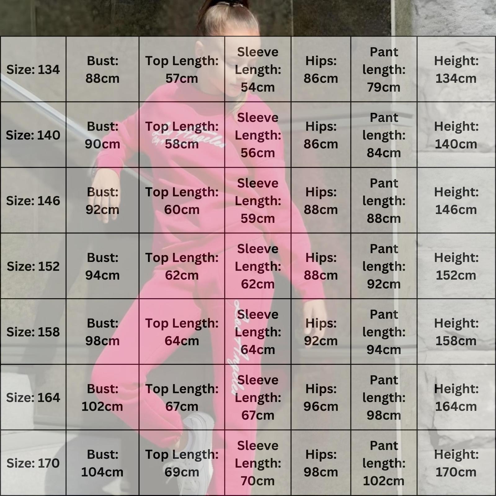 Size: 134, Height: 134 cm, Shoulders: 40 cm, Bust: 88 cm, Waist: 63 cm, Top Length: 57 cm, Sleeve: 54 cm, Hips: 86 cm, Pant Length: 79 cm
