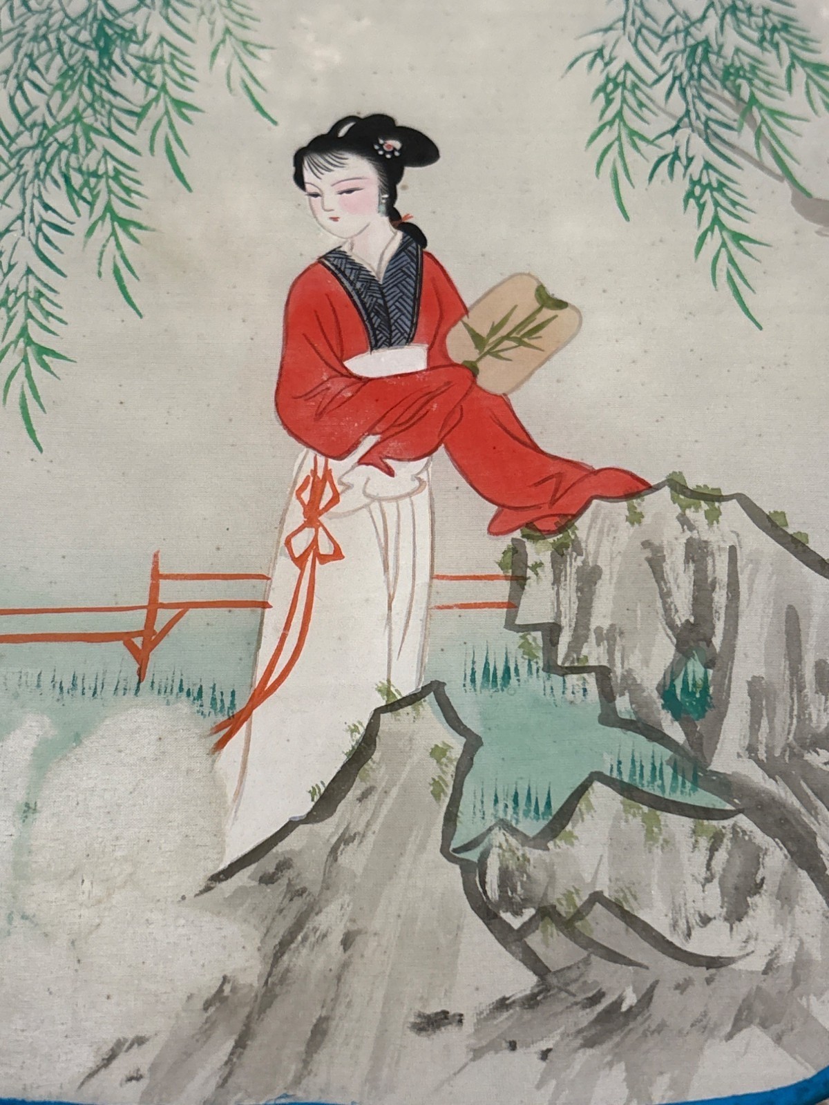 Vintage Hand-Painted Chinese Silk Fan With Woman In Red Kimono & Black Handle