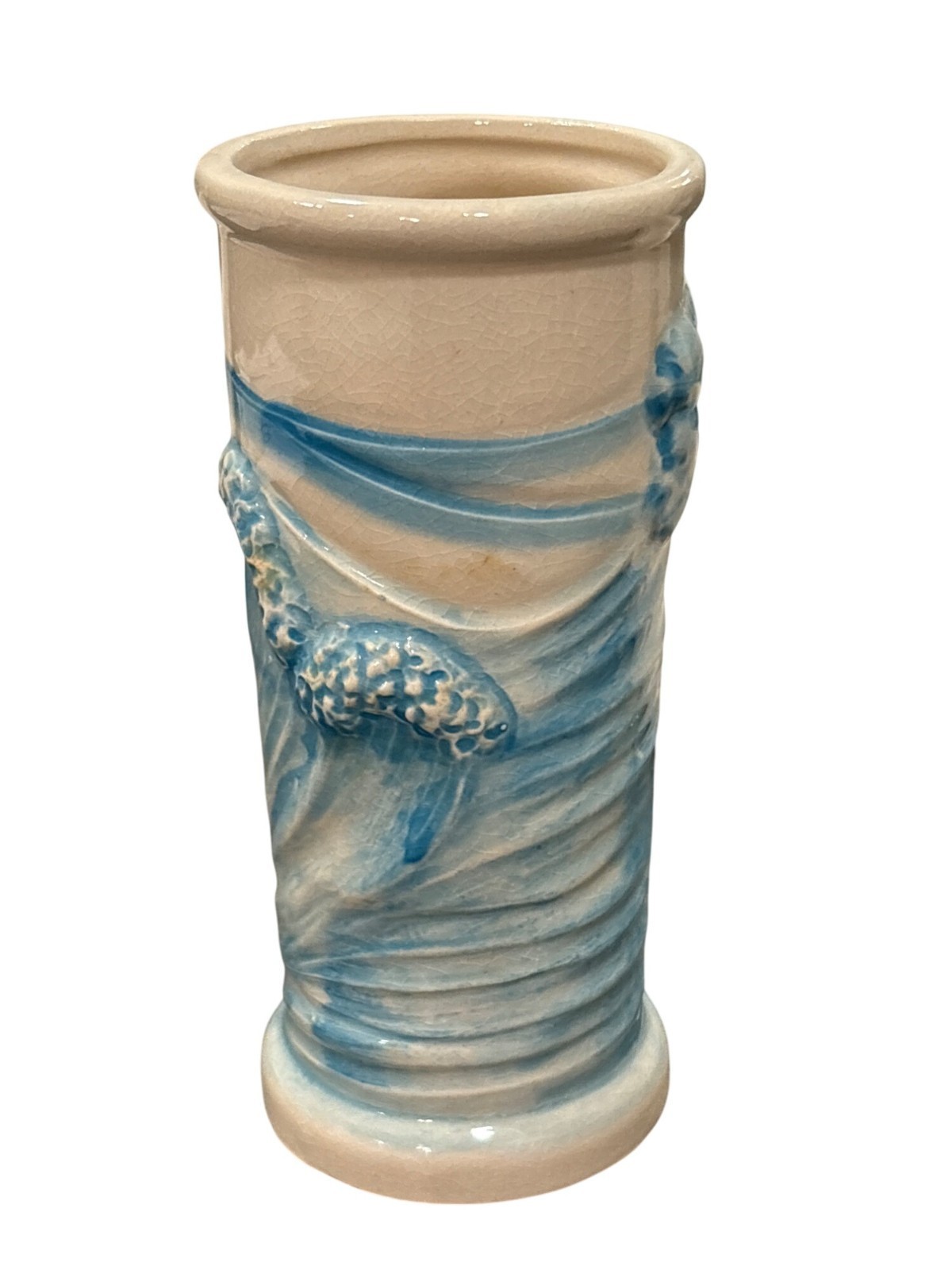 A charming, colorful tiki mug featuring a surfer girl amidst blue waves. Ideal for tiki bar decor, cocktail serving, or as a collectible.