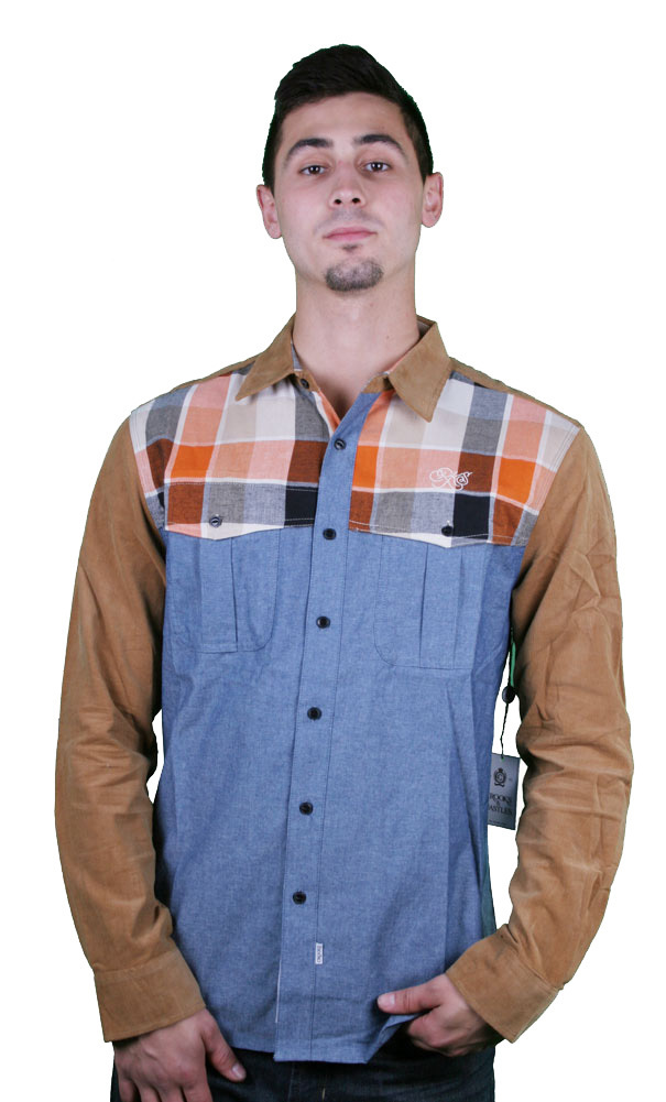 La camicia scozzese Crooks and Castles Sportsman Khaki Indaco/Arancio presenta un bottone sul davanti con il logo Crooks ricamato sul petto.