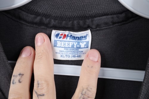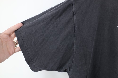 Collar stretched. Blemishes shoulders, collar/inner collar, back top. Dark spots, pilling. Collar, arms discolored. Graphics cracking/faded. Made in USA