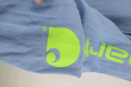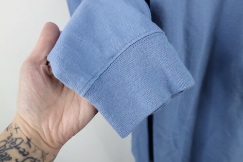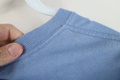 Loose thread collar. Blemishes collar, inner collar, back top. Graphics, color faded. Collar, cuffs discolored. Pilling