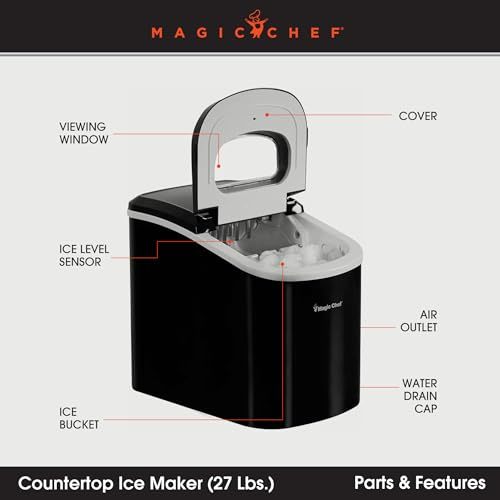 Product description: The Magic Chef Portable Countertop Ice Maker can make up to 27 lbs. of ice per day, providing you with a steady supply of ice. It is just what you need to continuously fill your ice bucket or beverage pitchers when you are entertaining friends and family. The ice maker can conveniently hold up to 1.5 lb. of ice at a time, and the digital control panel indicates when the storage bin needs to be emptied. The ice maker produces ice in 2 sizes in as little as 7 minutes. Not only do they provide a simple solution to producing large amounts of ice fast, the portable ice makers are compact and small enough to fit on your kitchen countertop or patio table.
