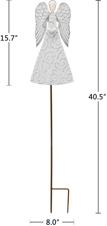 DIMENSIONS: The entire metal angel yard stake outdoor decor measures 40.5" X 8" X 1" after set up. Please note that 4-5" of the stem will be stuck into the ground for stable standing. Decorative garden stake is a nice addition to flower garden decoration, yard decor, patio decoration, flower bed decoration and porch decoration.