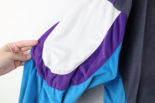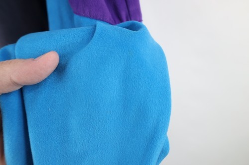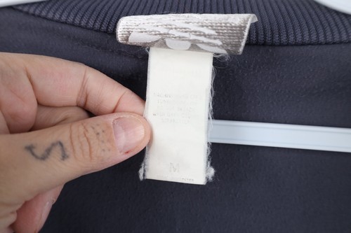 Stains left, right arm. Dark spots, pilling. Collar, cuffs, inner lining discolored. Color faded. Tag faded. Zipper tarnished