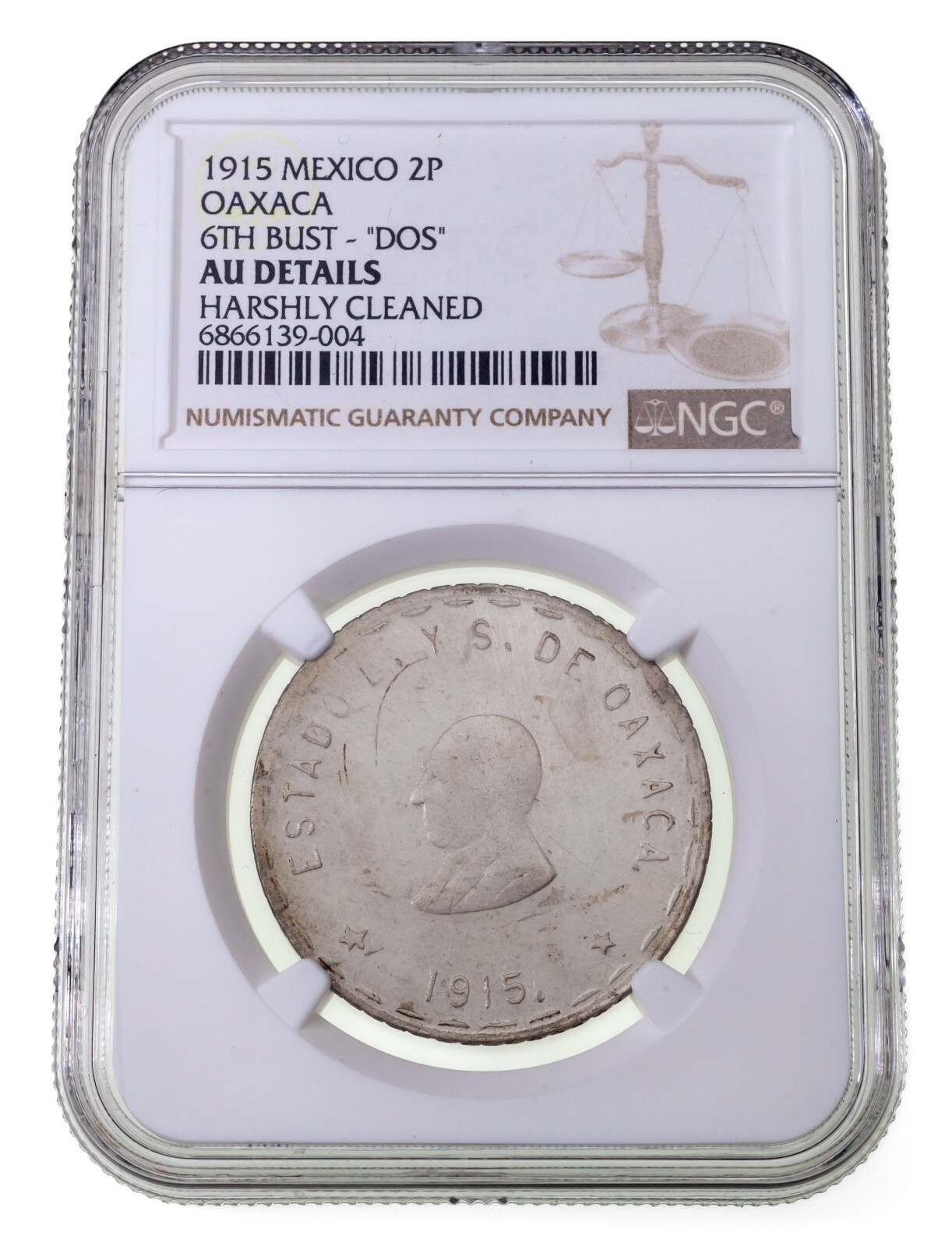 1915 Mexiko 2 Pesos Oaxaca 6. Büste - "dos" von NGC als Au -Details bewertet