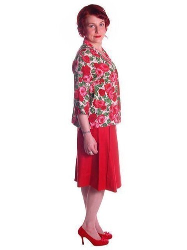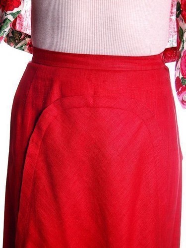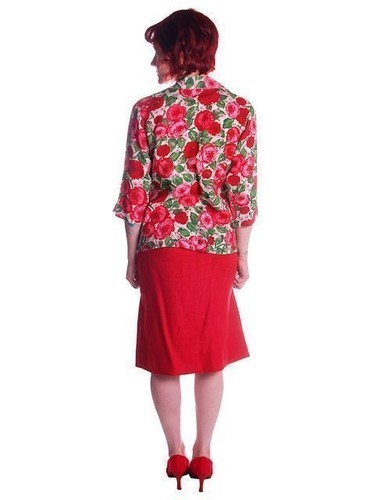 100% linen in matching red. Jacket with patch pockets, skirt with side zip.