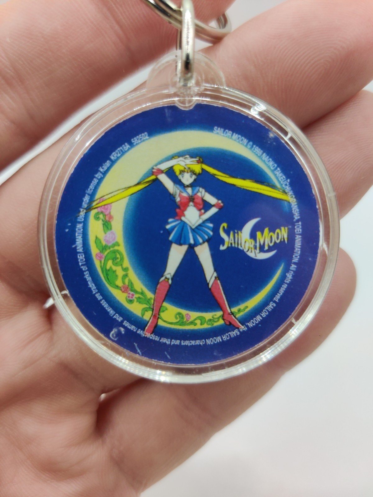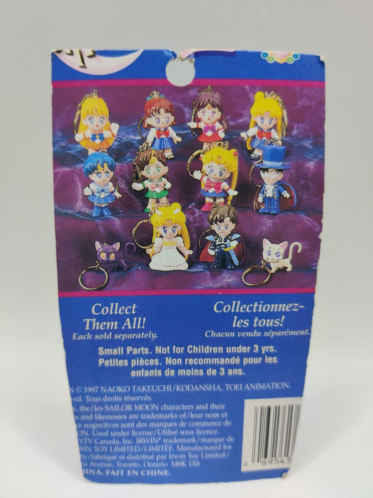 These keychains include Luna, Prince Endymion, and circular Sailor Moon, all in vibrant multicolor. Produced by IRWIN in 1997, these vintage keychains are part of the Sailor Moon franchise and have a theme of adventure.