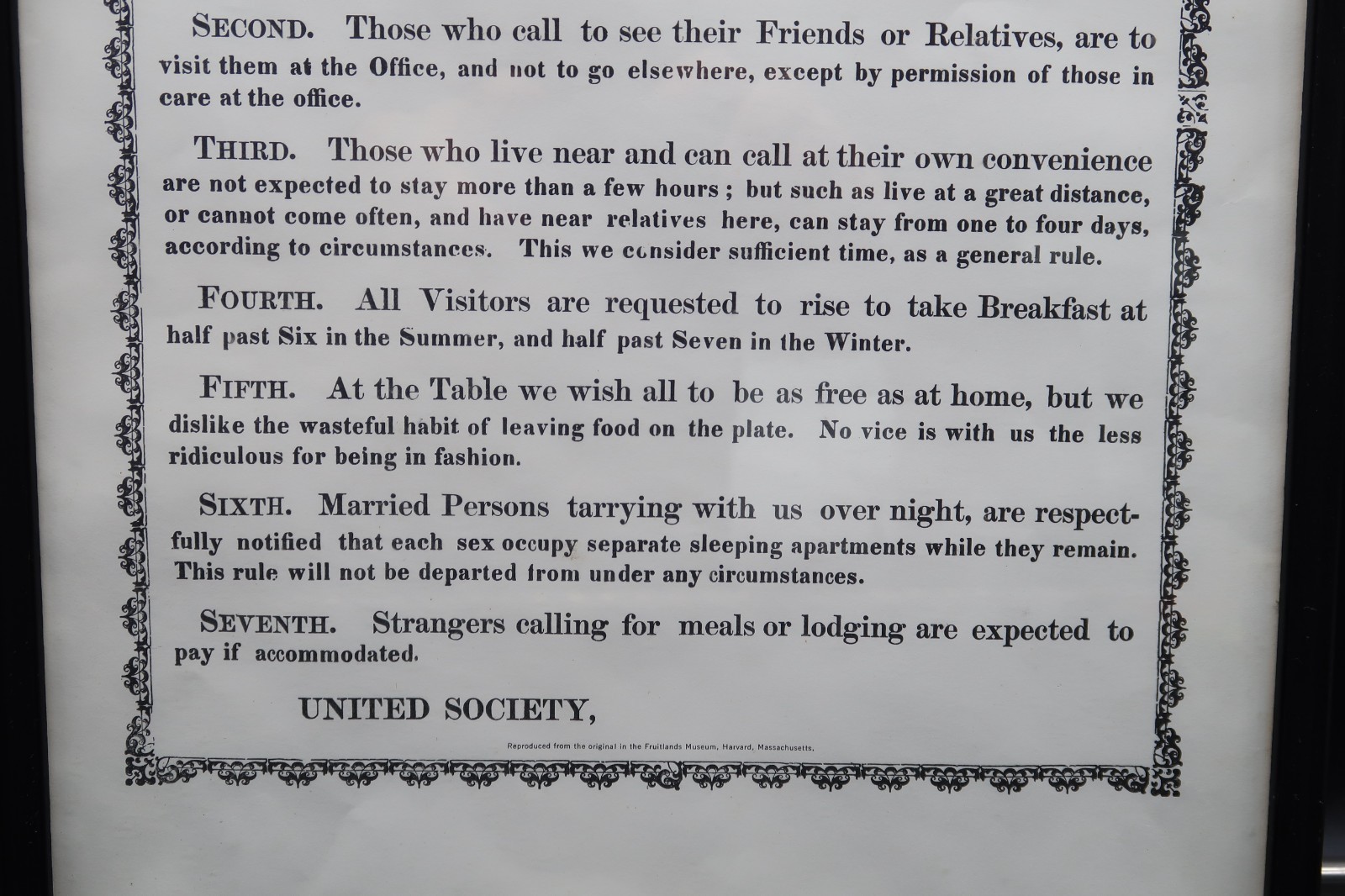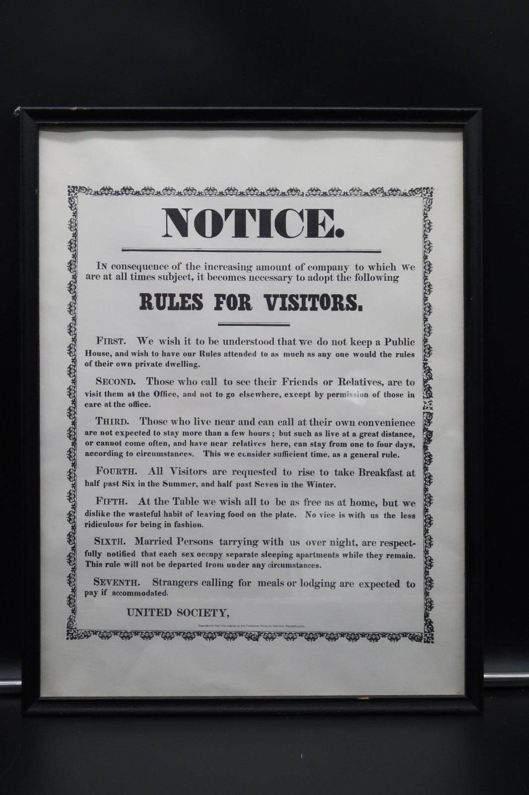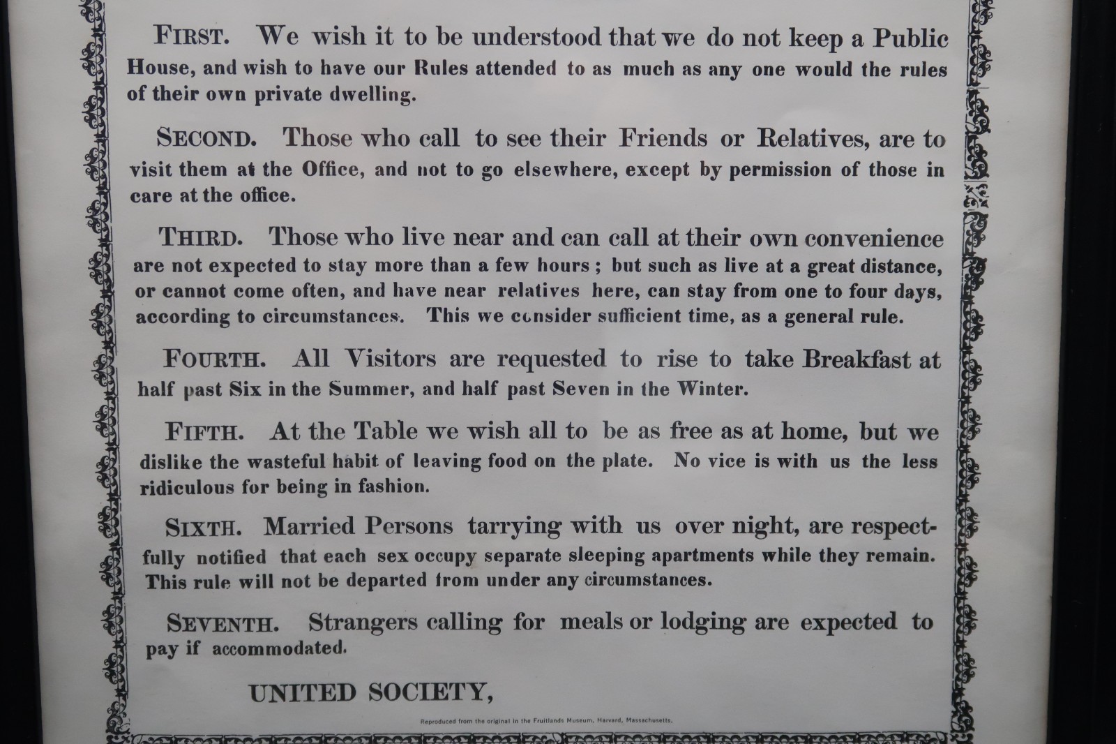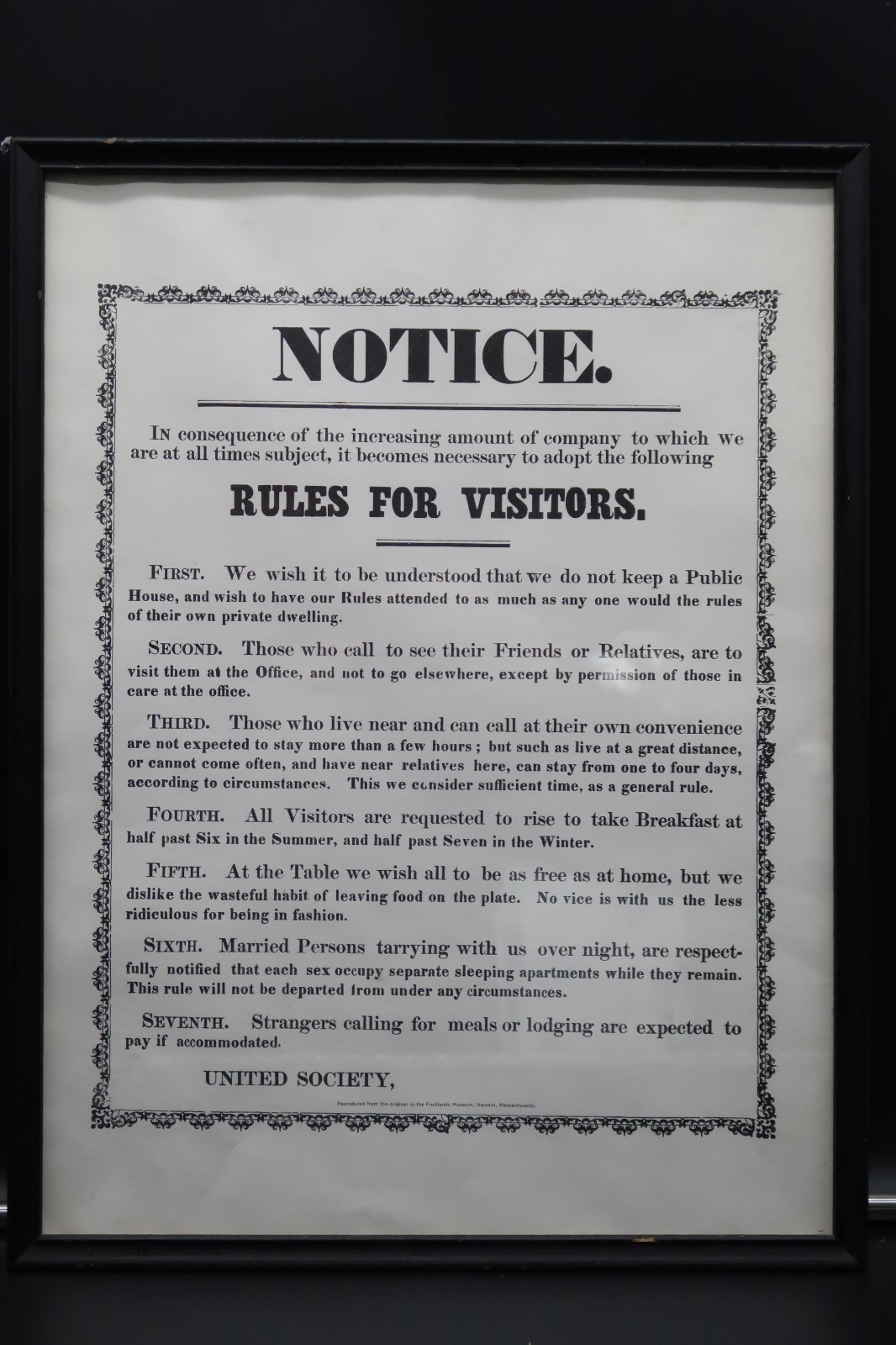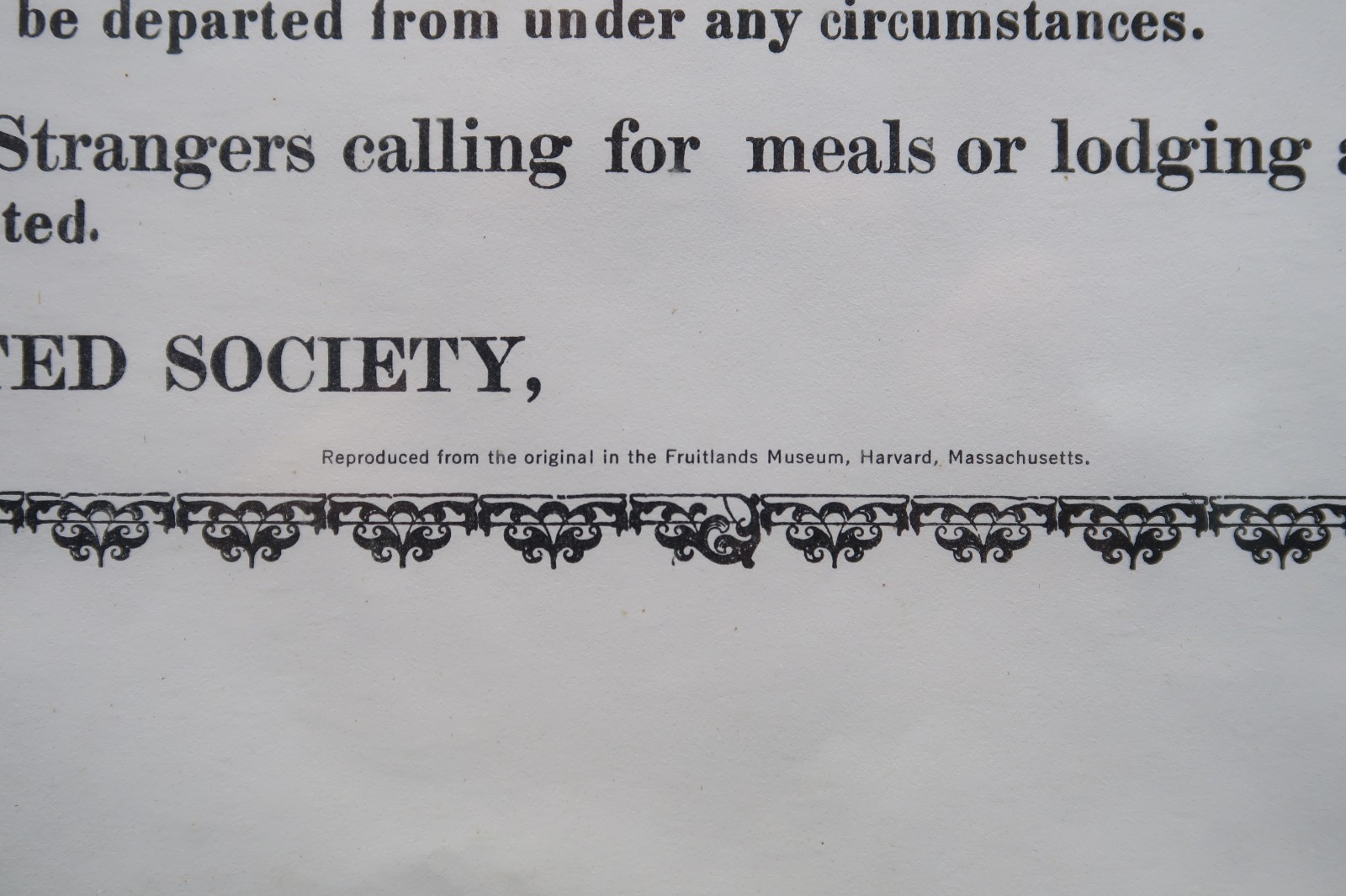 Vtg Reproduction Rules for Visitors Hancock Shakers Fruitland Museum Harvard MA
