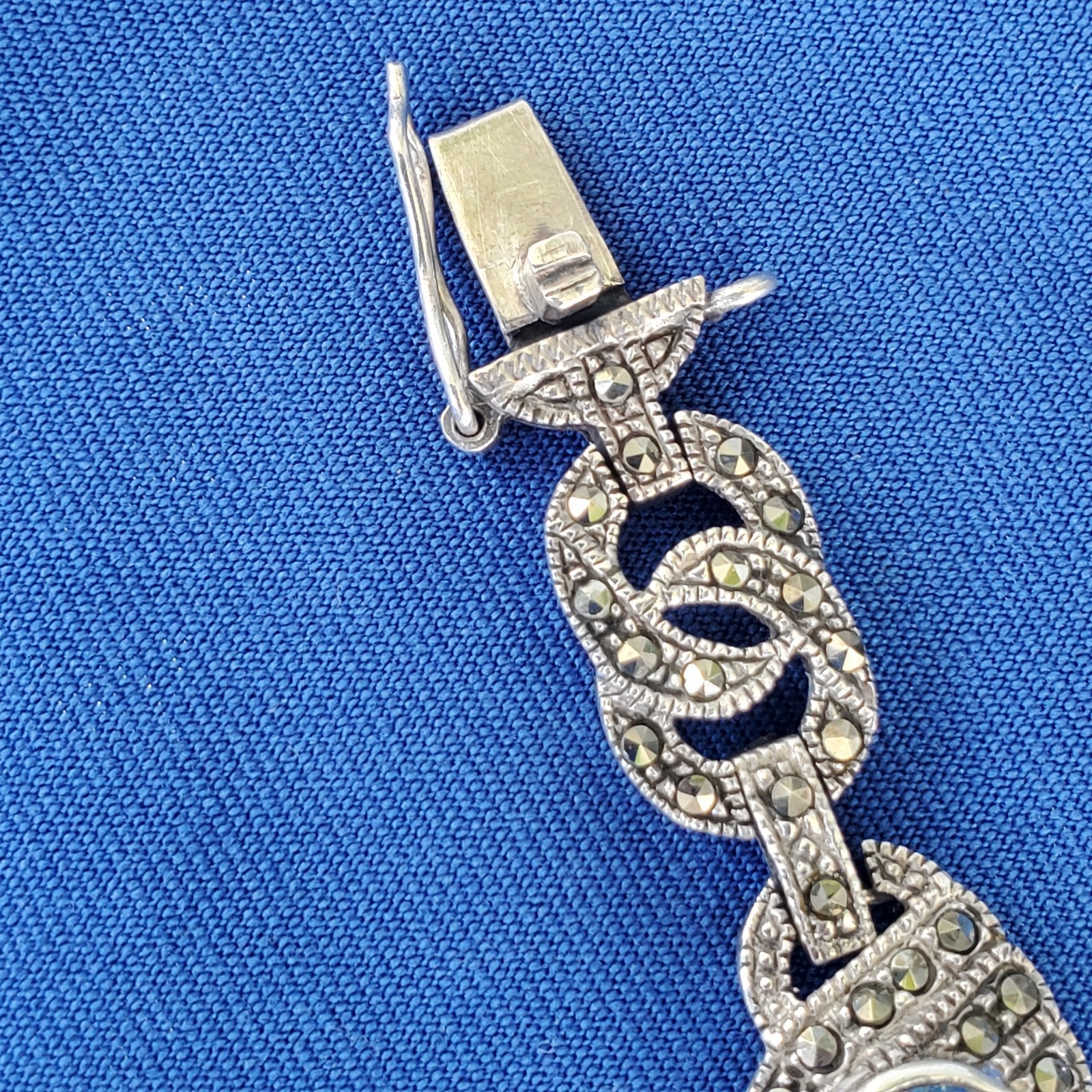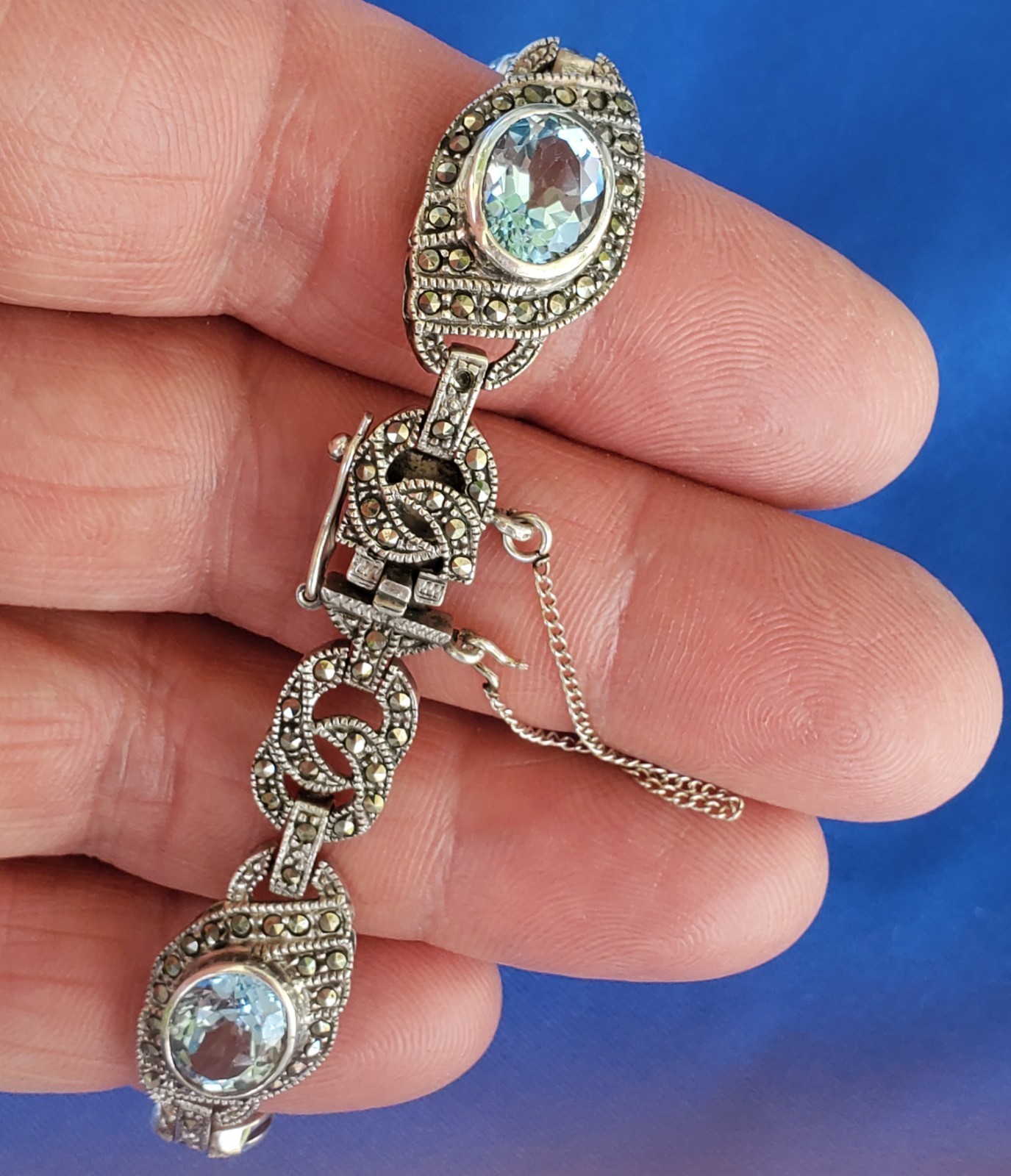 DESIGNER SIGNED 925 Sterling Silver BLUE TOPAZ Pave Marcasite Bracelet Chain 7.5