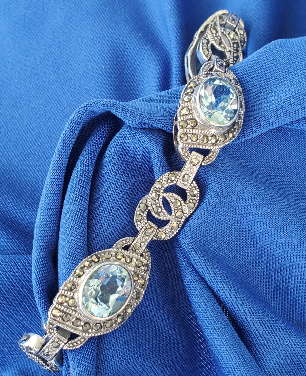 Designer 925 sterling blue topaz and marcasite filigree chain link bracelet.