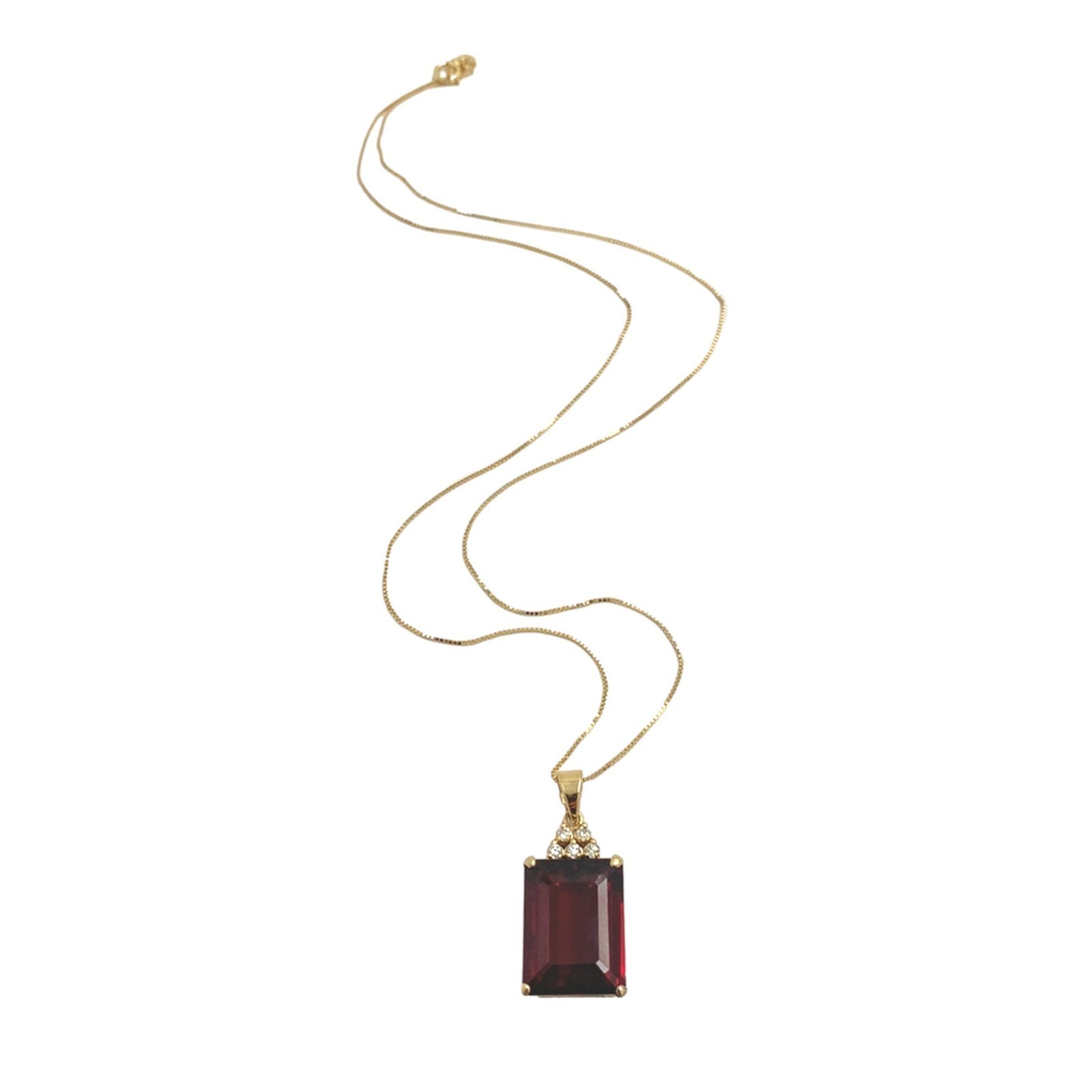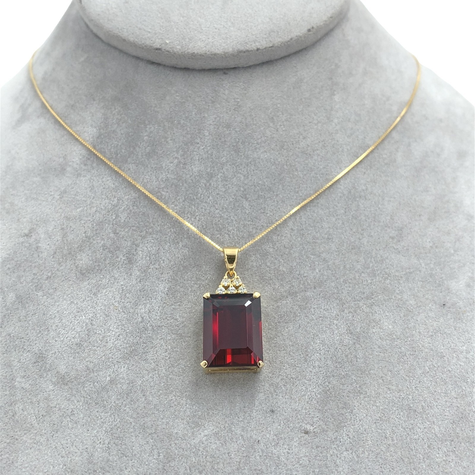 14k yellow gold garnet and diamond pendant featuring a large emerald cut genuine earth mined garnet. The garnet is a deep red color measuring about 16mm x 12.3mm x 6.7mm and weighing an estimated 13 carats. There are five round brilliant cut genuine earth mined diamonds measuring about 2mm and weighing about .10cts total.