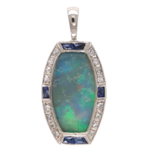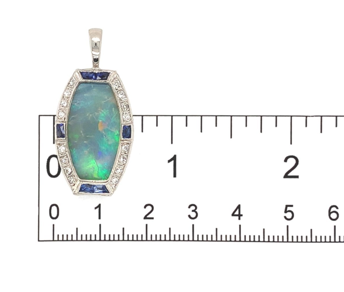 Platinum Australian opal and diamond pendant with calibre cut synthetic and glass blue lab-created sapphire accents. Repurposed from a watch, the crystal was replaced by a custom cut solid genuine earth mined Australian opal weighing 9.24 carats. The opal has primarily blue-green play of color.