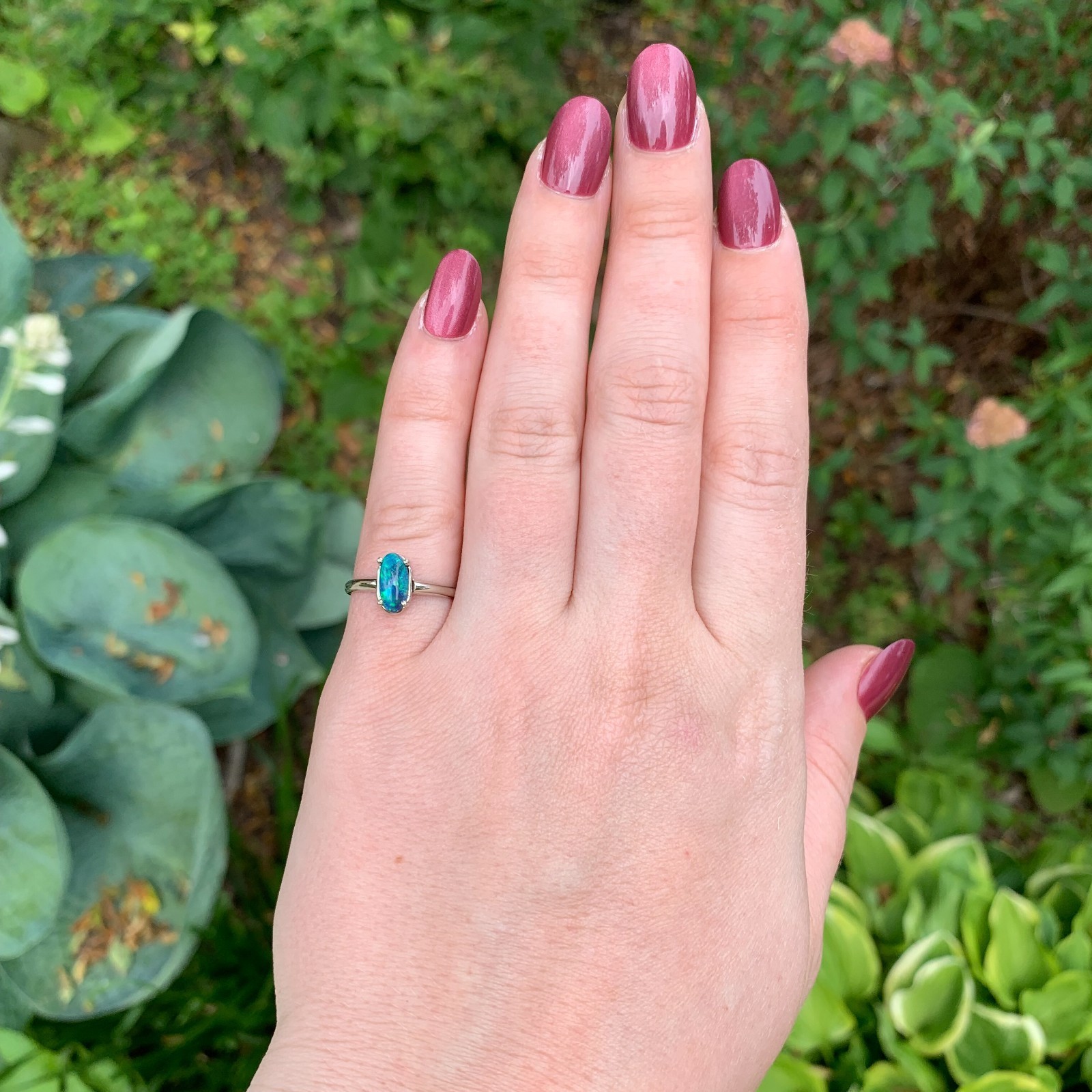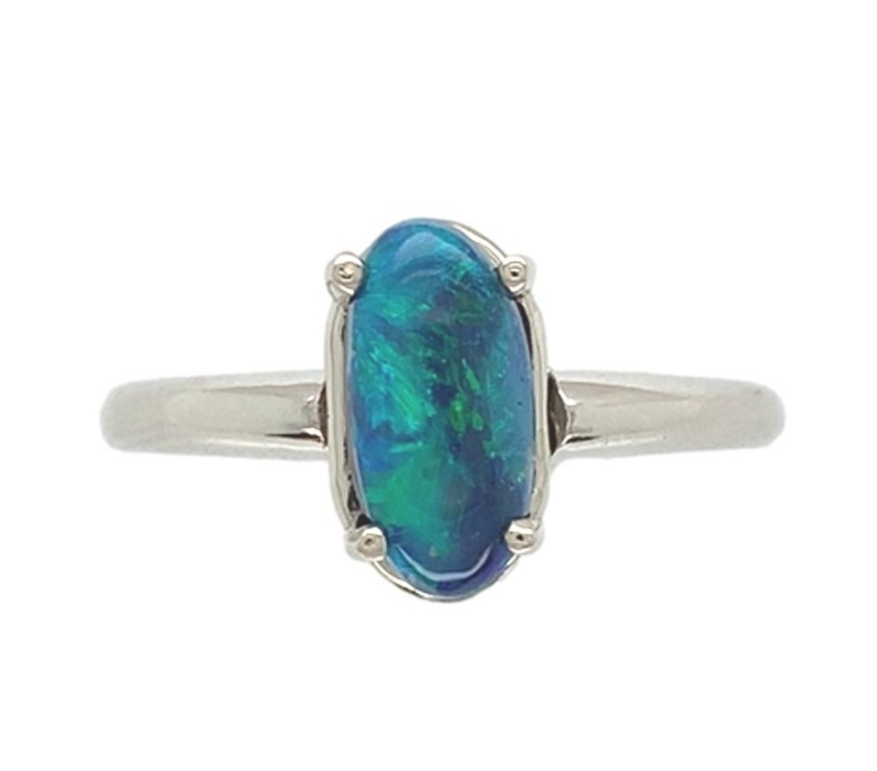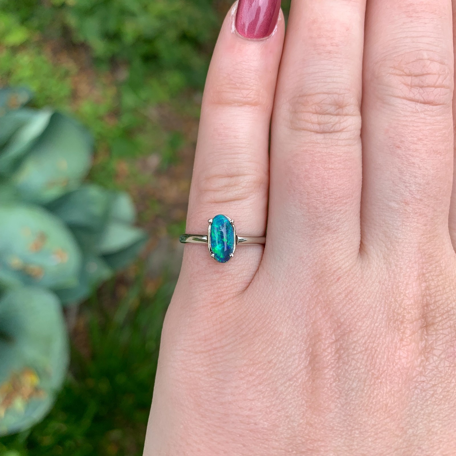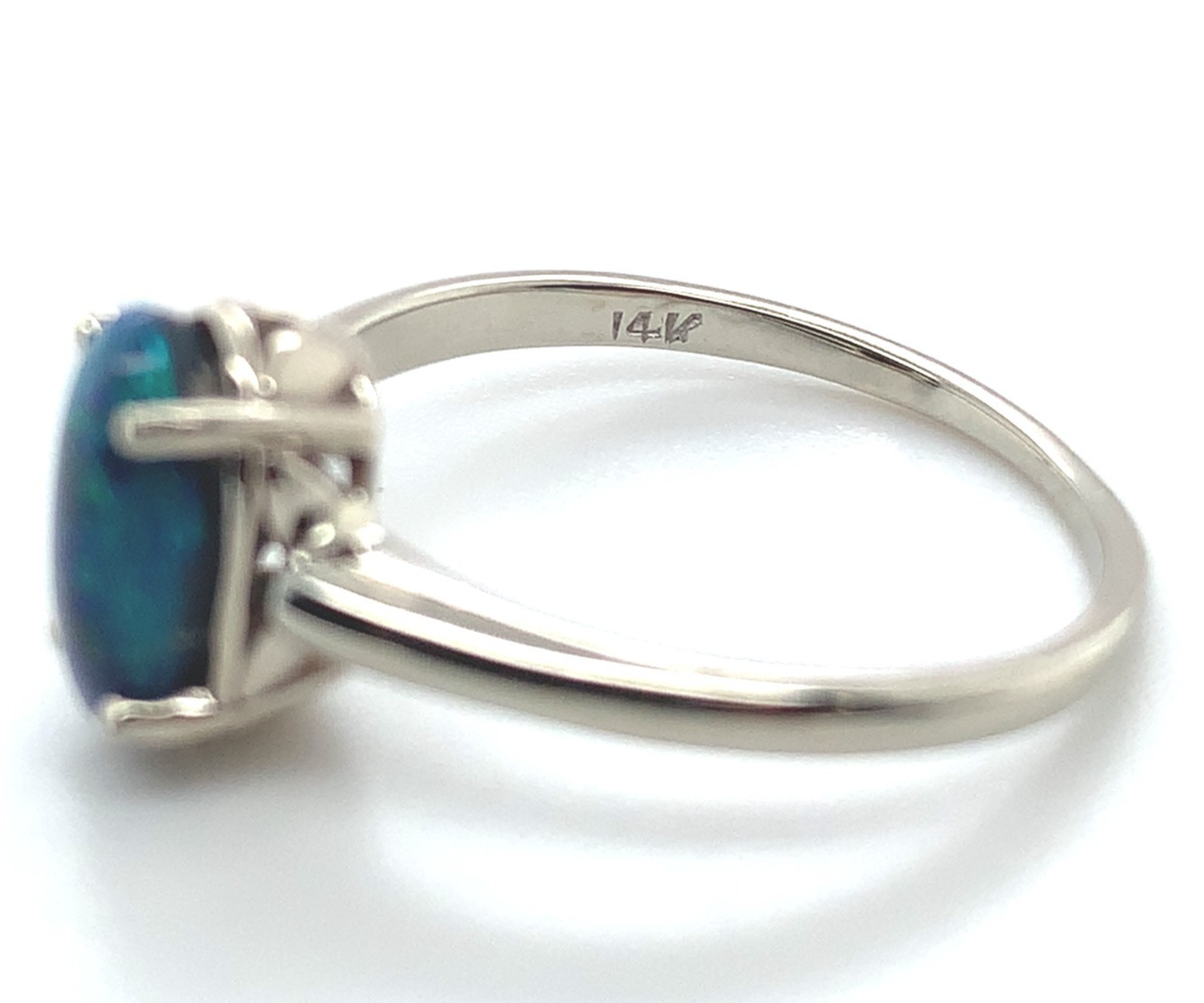 14k white gold Australian black opal ring. This is a natural earth mined black opal weighing .86cts. It is an elongated oval cabochon cut measuring about 9mm x 4.5mm. The opal has a dark navy blue to black body color with primarily blue-green play of color.