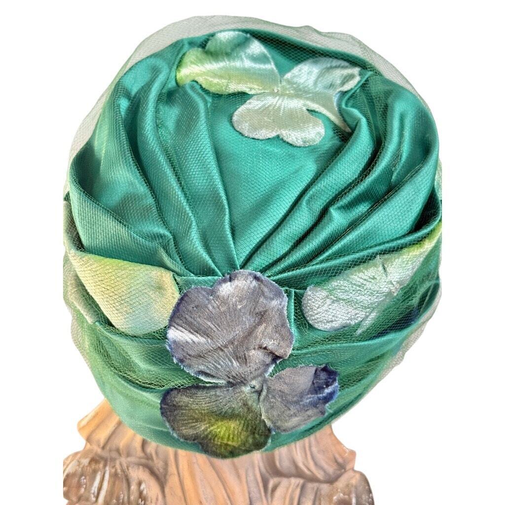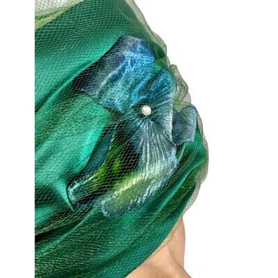 This lovely vintage 50s hat, by Rozanne of New York, is a stunning emerald green satin pillbox adorned with charming lavender velvet pansies nestled beneath delicate netting. It?s truly a beautiful piece of art you can wear! Perfectly sized small, with an inside head circumference of 19 inches. In excellent vintage condition.