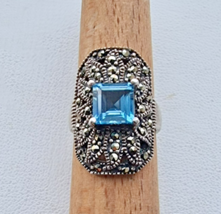 925 STERLING SILVER LONDON BLUE 7x7 mm. TOPAZ AND MARCASITE FLOWER RING SIZE 6