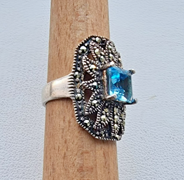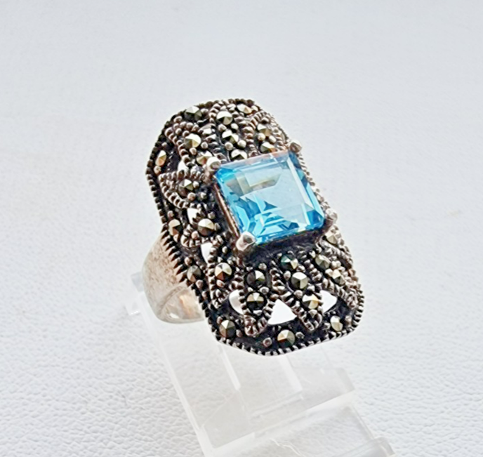 This product is a stunning 925 sterling silver ring featuring a beautiful London blue topaz and marcasite flower design. The intricate design and high quality materials make it a fine piece of jewelry that would make a perfect accessory for any occasion. The blue topaz adds a pop of color and elegance, while the marcasite enhances the overall charm and sophistication of the ring. The size of the ring is listed as a consideration, making it easy to find the perfect fit for any wearer.