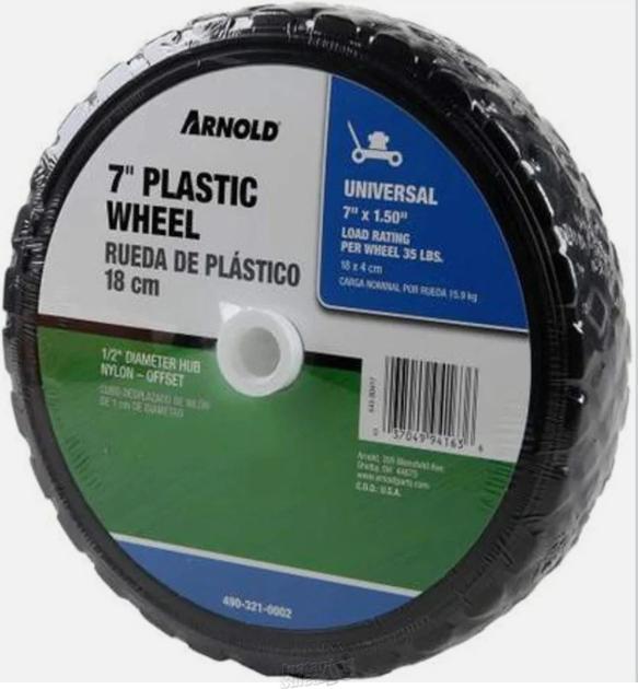 Arnold 490-321-0002 Plastic Wheel with 35 lb. Load Rating - 7-Inch x 1.5-Inch 7" x 1.50" plastic wheel with diamond tread for use on walk-behind mowers. 1/2" diameter offset hub 1-3/8" hub length 35 lb. load rating 1/2" nylon bearing