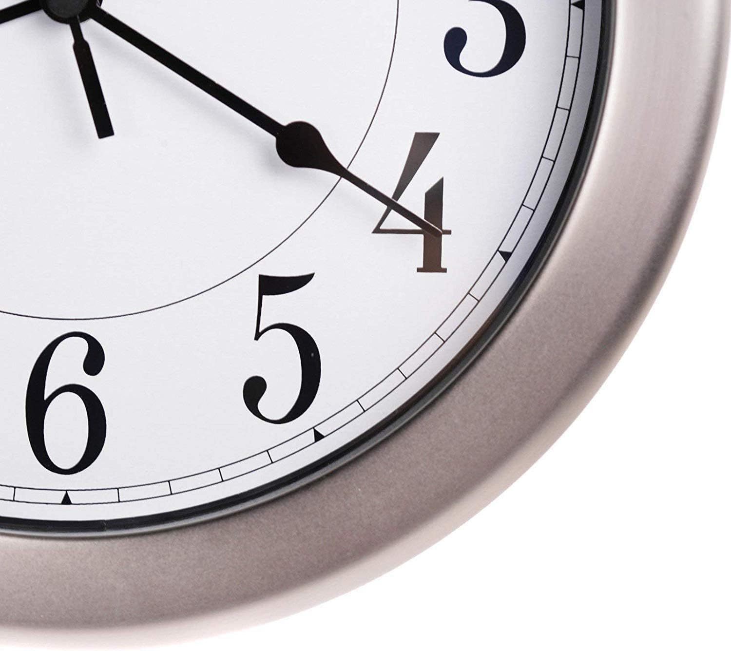 SLEEK DESIGN: Enhance your space with this modern wall clock, featuring a brushed nickel-finished case that blends seamlessly with any living room decor, kitchen wall decor, or office wall decor. The round wall clock design makes it an elegant decorative wall clock for any setting. Its minimalist style ensures it fits as a wall clock for bedroom, kitchen wall clock, or modern wall clock, making it a versatile room decor addition. Battery Operated (not included).